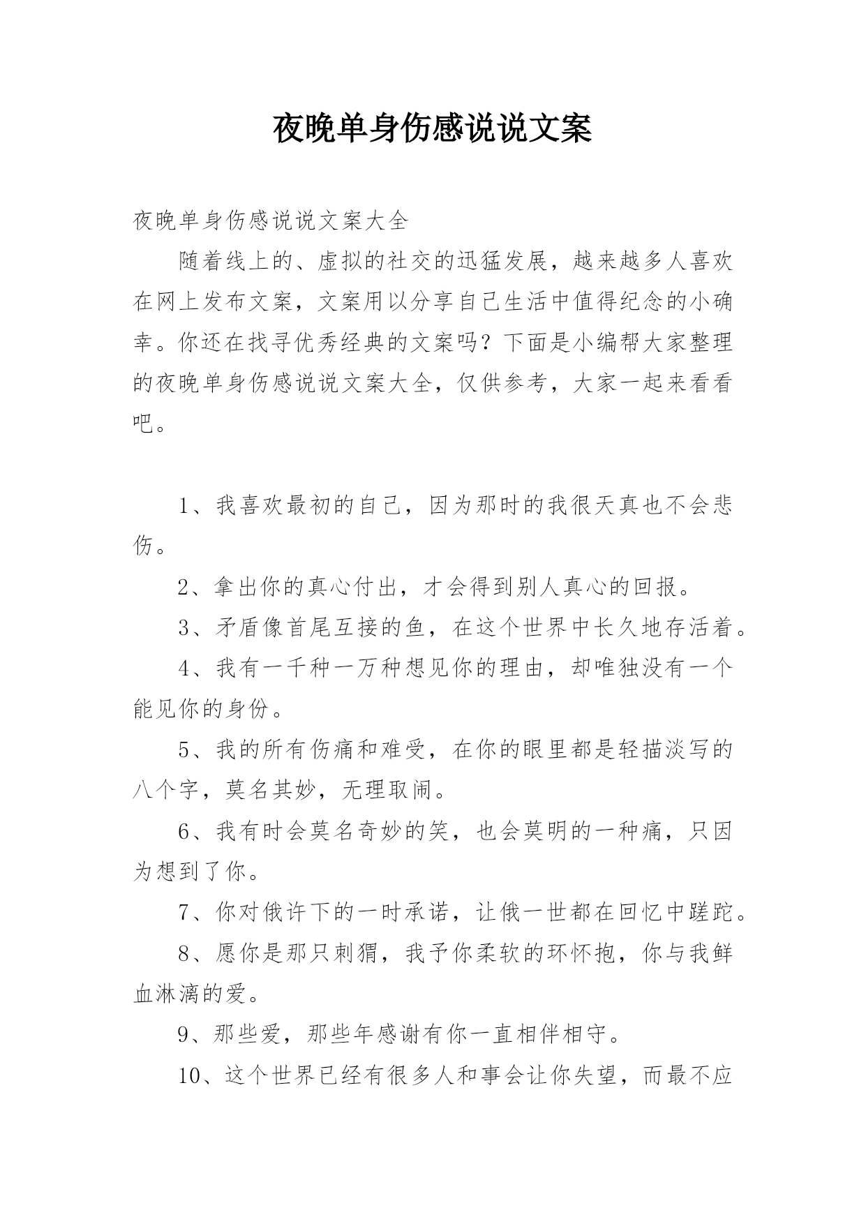 夜晚单身伤感说说文案夜晚单身伤感说说文案大全随着线上的、虚拟的社交的迅猛发展,越来越多人喜欢在网上发布文案,文案用以分享自己生活中值得纪念的小确幸。你还在找寻优秀经典的文案吗?下面是小编帮大家整理的夜晚单身伤感说说文案大全,仅供参考,大家一起来看看吧。1、我喜欢最初的自己,因为那时的我很天真也不会悲伤。2、拿出你的真心付出,才会得到别人真心的回报。3、矛盾像首尾互接的鱼,在这个世界中长久地存活着。4、我有一千种一万种想见你的理由,却唯独没有一个能见你的身份。5、我的所有伤痛和难受,在你的眼里都是轻描淡写的