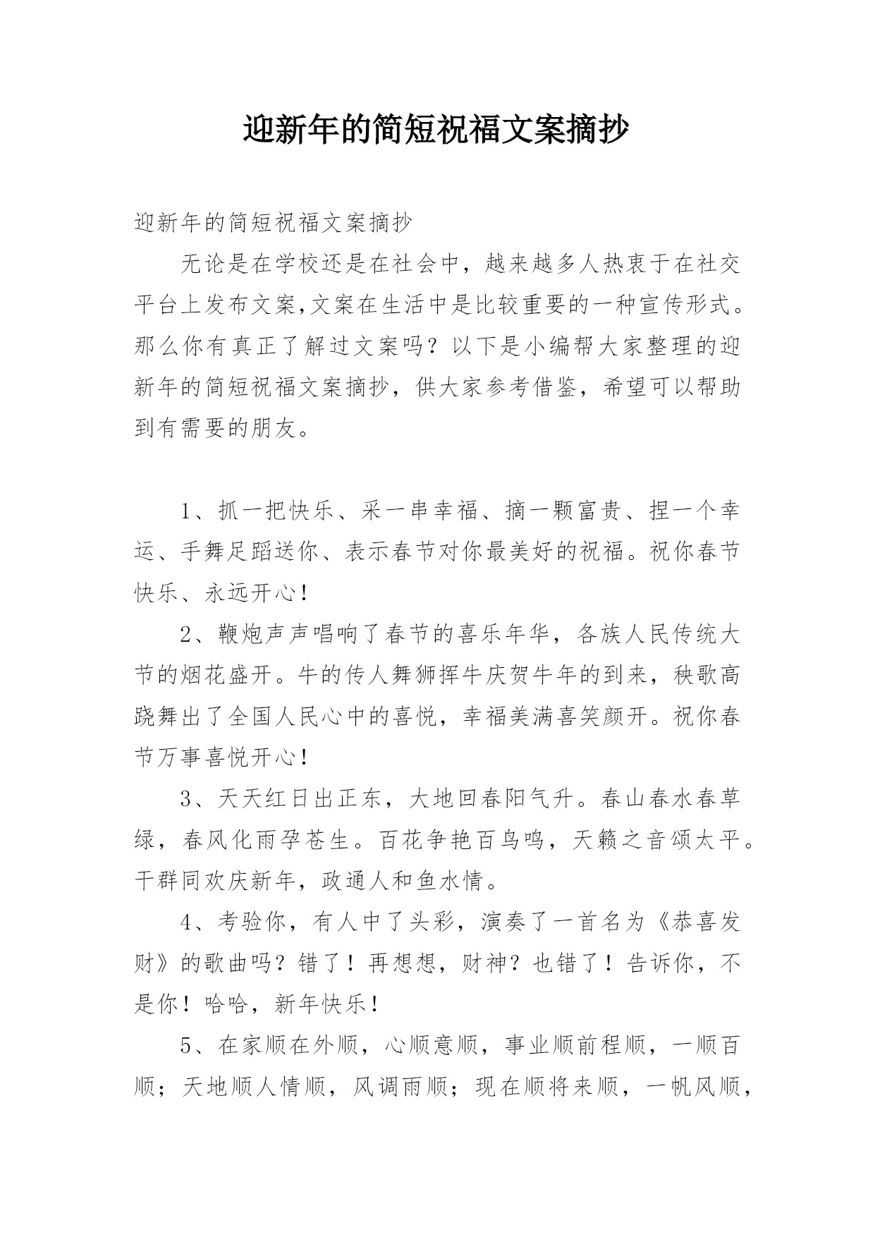 迎新年的简短祝福文案摘抄迎新年的简短祝福文案摘抄无论是在学校还是在社会中,越来越多人热衷于在社交平台上发布文案,文案在生活中是比较重要的一种宣传形式。那么你有真正了解过文案吗?以下是小编帮大家整理的迎新年的简短祝福文案摘抄,供大家参考借鉴,希望可以帮助到有需要的朋友。1、抓一把快乐、采一串幸福、摘一颗富贵、捏一个幸运、手舞足蹈送你、表示春节对你最美好的祝福。祝你春节快乐、永远开心!2、鞭炮声声唱响了春节的喜乐年华,各族人民传统大节的烟花盛开。牛的传人舞狮挥牛庆贺牛年的到来,秧歌高跷舞出了全国人民心中的喜悦
