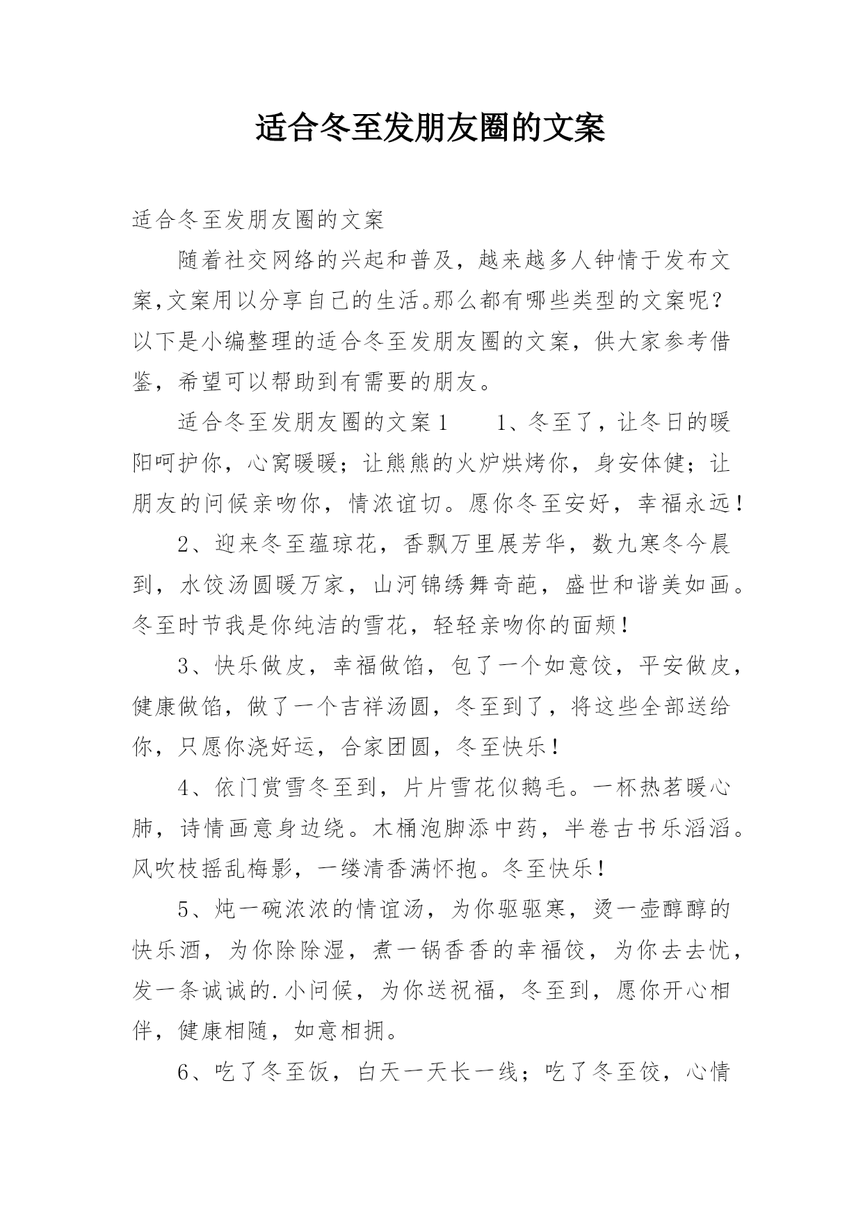 适合冬至发朋友圈的文案适合冬至发朋友圈的文案随着社交网络的兴起和普及,越来越多人钟情于发布文案,文案用以分享自己的生活。那么都有哪些类型的文案呢?以下是小编整理的适合冬至发朋友圈的文案,供大家参考借鉴,希望可以帮助到有需要的朋友。适合冬至发朋友圈的文案11、冬至了,让冬日的暖阳呵护你,心窝暖暖;让熊熊的火炉烘烤你,身安体健;让朋友的问候亲吻你,情浓谊切。愿你冬至安好,幸福永远!2、迎来冬至蕴琼花,香飘万里展芳华,数九寒冬今晨到,水饺汤圆暖万家,山河锦绣舞奇葩,盛世和谐美如画。冬至时节我是你纯洁的雪花,轻轻