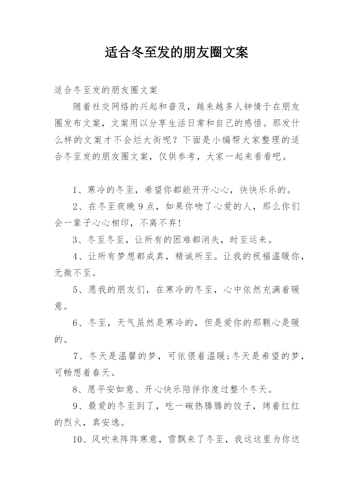 适合冬至发的朋友圈文案适合冬至发的朋友圈文案随着社交网络的兴起和普及,越来越多人钟情于在朋友圈发布文案,文案用以分享生活日常和自己的感悟。那发什么样的文案才不会烂大街呢?下面是小编帮大家整理的适合冬至发的朋友圈文案,仅供参考,大家一起来看看吧。1、寒冷的冬至,希望你都能开开心心,快快乐乐的。2、在冬至夜晚9点,如果你吻了心爱的人,那么你们会一辈子心心相印,不离不弃!3、冬至冬至,让所有的困难都消失,时至运来。4、让所有梦想都成真,精诚所至。让我的祝福温暖你,无微不至。5、愿我的朋友们,在寒冷的冬至,心中依