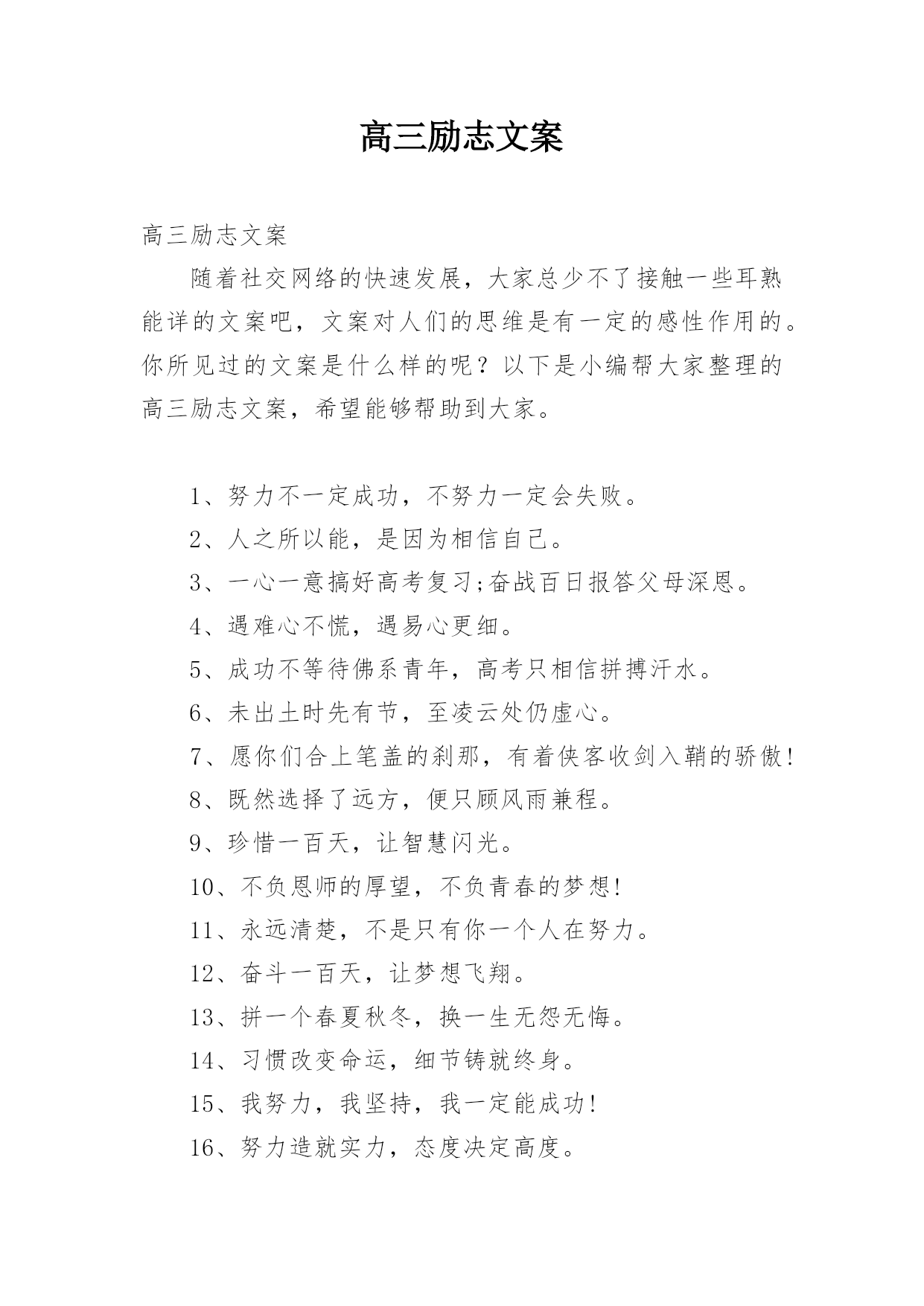 高三励志文案高三励志文案随着社交网络的快速发展,大家总少不了接触一些耳熟能详的文案吧,文案对人们的思维是有一定的感性作用的。你所见过的文案是什么样的呢?以下是小编帮大家整理的高三励志文案,希望能够帮助到大家。1、努力不一定成功,不努力一定会失败。2、人之所以能,是因为相信自己。3、一心一意搞好高考复习;奋战百日报答父母深恩。4、遇难心不慌,遇易心更细。5、成功不等待佛系青年,高考只相信拼搏汗水。6、未出土时先有节,至凌云处仍虚心。7、愿你们合上笔盖的刹那,有着侠客收剑入鞘的骄傲!8、既然选择了远方,便只顾