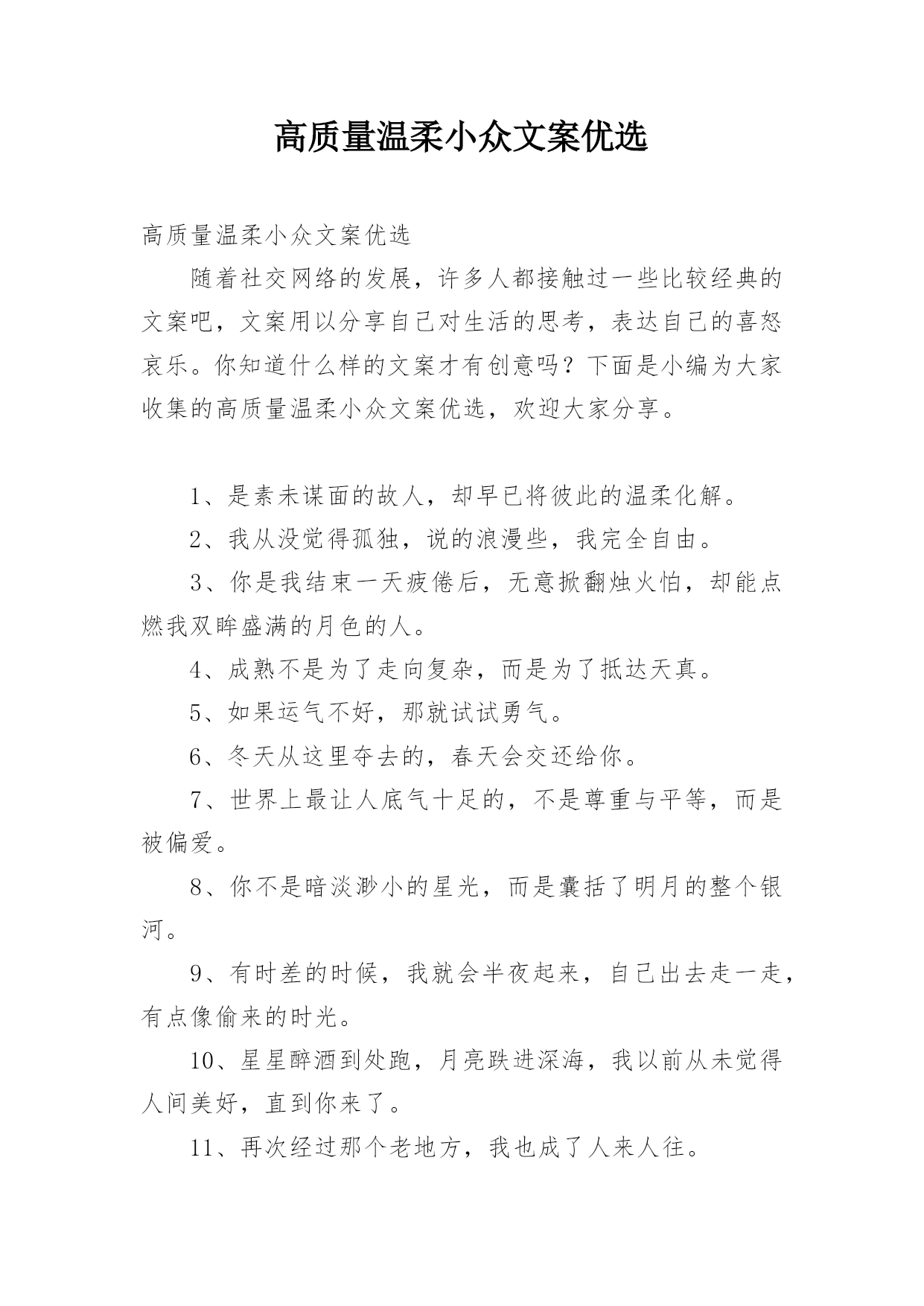 高质量温柔小众文案优选高质量温柔小众文案优选随着社交网络的发展,许多人都接触过一些比较经典的文案吧,文案用以分享自己对生活的思考,表达自己的喜怒哀乐。你知道什么样的文案才有创意吗?下面是小编为大家收集的高质量温柔小众文案优选,欢迎大家分享。1、是素未谋面的故人,却早已将彼此的温柔化解。2、我从没觉得孤独,说的浪漫些,我完全自由。3、你是我结束一天疲倦后,无意掀翻烛火怕,却能点燃我双眸盛满的月色的人。4、成熟不是为了走向复杂,而是为了抵达天真。5、如果运气不好,那就试试勇气。6、冬天从这里夺去的,春天会交还