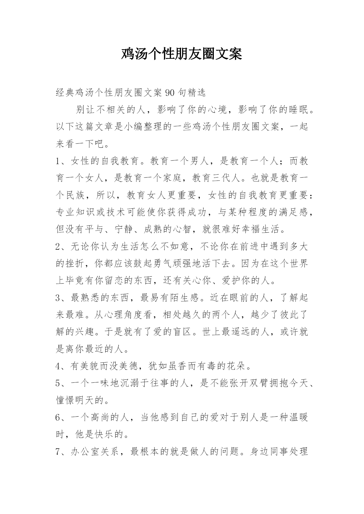 鸡汤个性朋友圈文案经典鸡汤个性朋友圈文案90句精选别让不相关的人,影响了你的心境,影响了你的睡眠。以下这篇文章是小编整理的一些鸡汤个性朋友圈文案,一起来看一下吧。1、女性的自我教育。教育一个男人,是教育一个人;而教育一个女人,是教育一个家庭,教育三代人。也就是教育一个民族,所以,教育女人更重要,女性的自我教育更重要:专业知识或技术可能使你获得成功,与某种程度的满足感,但没有平与、宁静、成熟的心智,就很难好幸福生活。2、无论你认为生活怎么不如意,不论你在前进中遇到多大的挫折,你都应该鼓起勇气顽强地活下去。因