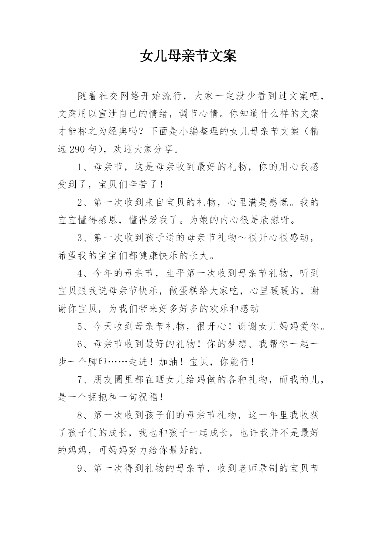 女儿母亲节文案随着社交网络开始流行,大家一定没少看到过文案吧,文案用以宣泄自己的情绪,调节心情。你知道什么样的文案才能称之为经典吗?下面是小编整理的女儿母亲节文案(精选290句),欢迎大家分享。1、母亲节,这是母亲收到最好的礼物,你的用心我感受到了,宝贝们辛苦了!2、第一次收到来自宝贝的礼物,心里满是感慨。我的宝宝懂得感恩,懂得爱我了。为娘的内心很是欣慰呀。3、第一次收到孩子送的母亲节礼物~很开心很感动,希望我的宝宝们都健康快乐的长大。4、今年的母亲节,生平第一次收到母亲节礼物,听到宝贝跟我说母亲节快乐,