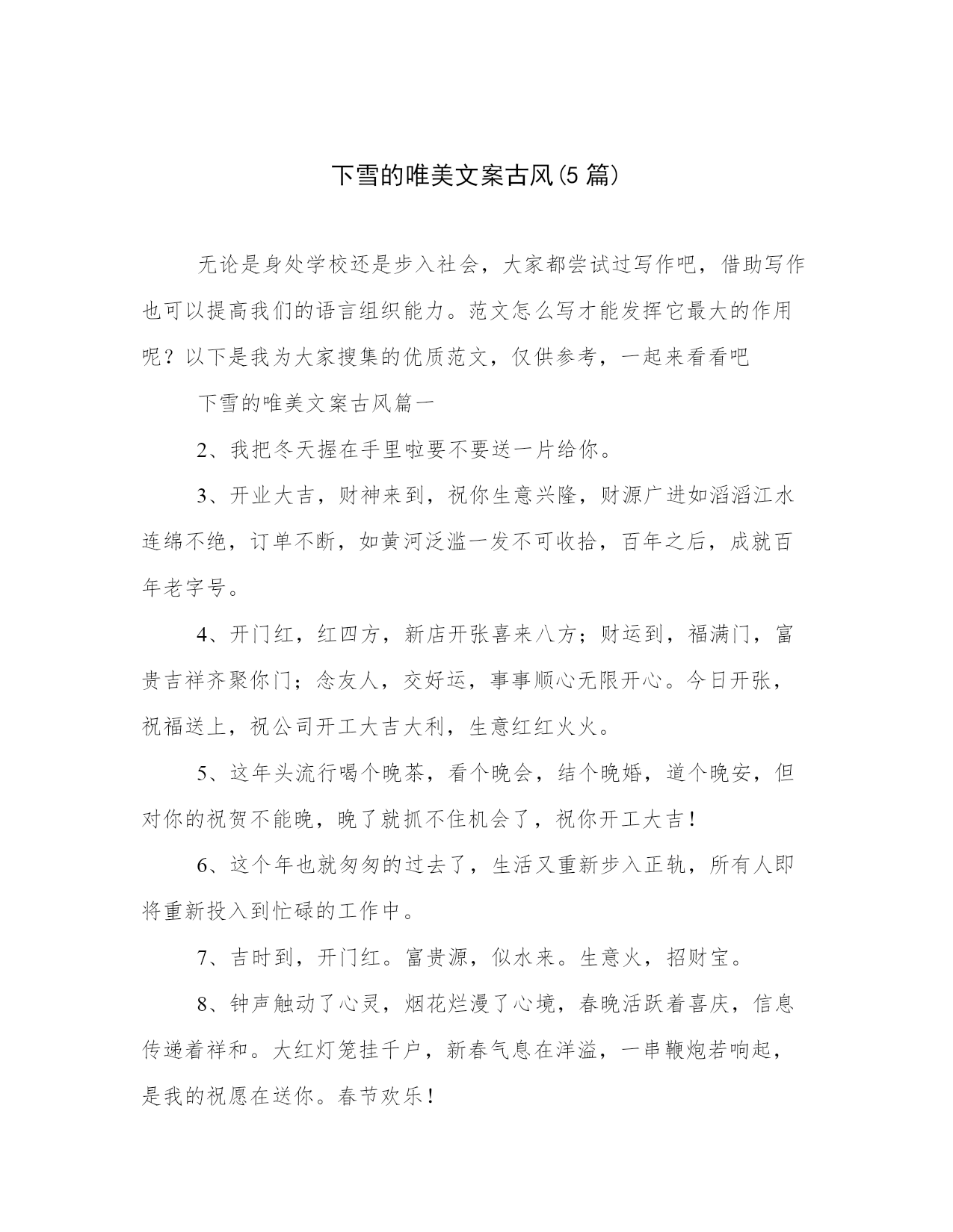 下雪的唯美文案古风(5篇)无论是身处学校还是步入社会,大家都尝试过写作吧,借助写作也可以提高我们的语言组织能力。范文怎么写才能发挥它最大的作用呢?以下是我为大家搜集的优质范文,仅供参考,一起来看看吧下雪的唯美文案古风篇一2、我把冬天握在手里啦要不要送一片给你。3、开业大吉,财神来到,祝你生意兴隆,财源广进如滔滔江水连绵不绝,订单不断,如黄河泛滥一发不可收拾,百年之后,成就百年老字号。4、开门红,红四方,新店开张喜来八方;财运到,福满门,富贵吉祥齐聚你门;念友人,交好运,事事顺心无限开心。今日开张,祝福送上