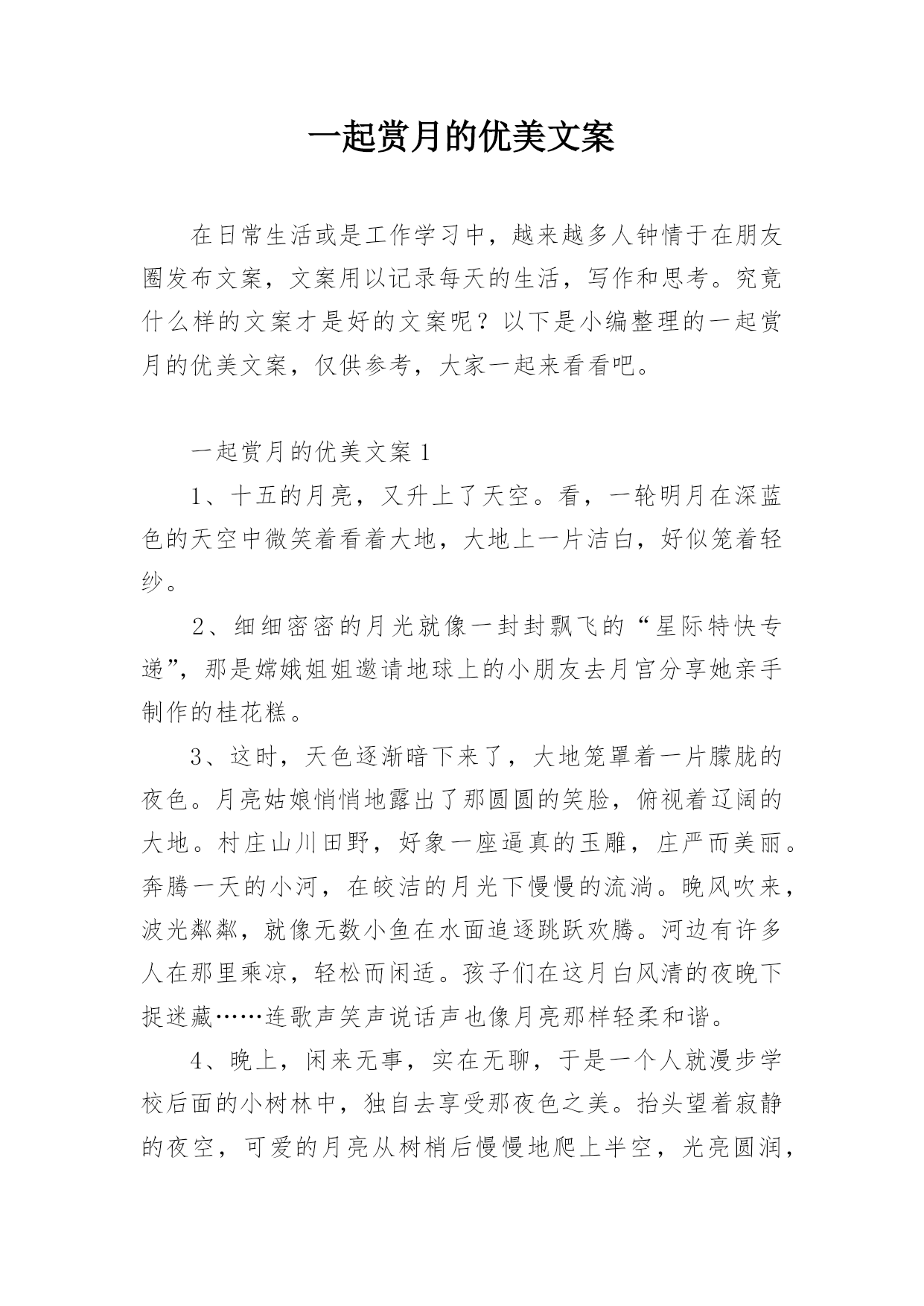 一起赏月的优美文案在日常生活或是工作学习中,越来越多人钟情于在朋友圈发布文案,文案用以记录每天的生活,写作和思考。究竟什么样的文案才是好的文案呢?以下是小编整理的一起赏月的优美文案,仅供参考,大家一起来看看吧。一起赏月的优美文案11、十五的月亮,又升上了天空。看,一轮明月在深蓝色的天空中微笑着看着大地,大地上一片洁白,好似笼着轻纱。2、细细密密的月光就像一封封飘飞的“星际特快专递”,那是嫦娥姐姐邀请地球上的小朋友去月宫分享她亲手制作的桂花糕。3、这时,天色逐渐暗下来了,大地笼罩着一片朦胧的夜色。月亮姑娘悄