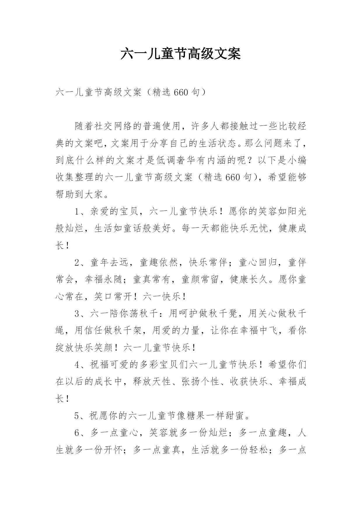 六一儿童节高级文案六一儿童节高级文案(精选660句)随着社交网络的普遍使用,许多人都接触过一些比较经典的文案吧,文案用于分享自己的生活状态。那么问题来了,到底什么样的文案才是低调奢华有内涵的呢?以下是小编收集整理的六一儿童节高级文案(精选660句),希望能够帮助到大家。1、亲爱的宝贝,六一儿童节快乐!愿你的笑容如阳光般灿烂,生活如童话般美好。每一天都能快乐无忧,健康成长!2、童年去远,童趣依然,快乐常伴;童心回归,童伴常会,幸福永随;童真常有,童颜常留,健康长久。愿你童心常在,笑口常开!六一快乐!3、六一
