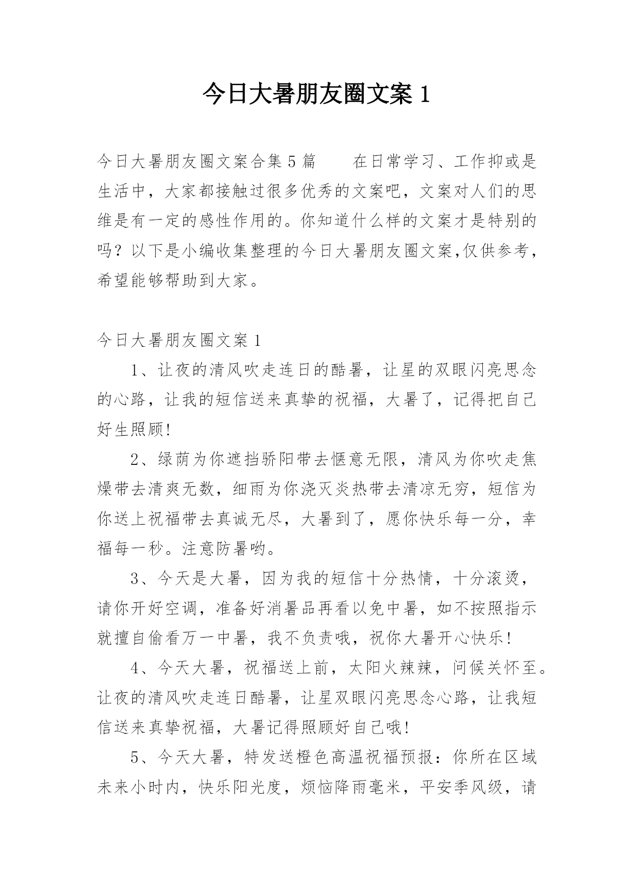 今日大暑朋友圈文案1今日大暑朋友圈文案合集5篇在日常学习、工作抑或是生活中,大家都接触过很多优秀的文案吧,文案对人们的思维是有一定的感性作用的。你知道什么样的文案才是特别的吗?以下是小编收集整理的今日大暑朋友圈文案,仅供参考,希望能够帮助到大家。今日大暑朋友圈文案11、让夜的清风吹走连日的酷暑,让星的双眼闪亮思念的心路,让我的短信送来真挚的祝福,大暑了,记得把自己好生照顾!2、绿荫为你遮挡骄阳带去惬意无限,清风为你吹走焦燥带去清爽无数,细雨为你浇灭炎热带去清凉无穷,短信为你送上祝福带去真诚无尽,大暑到了,