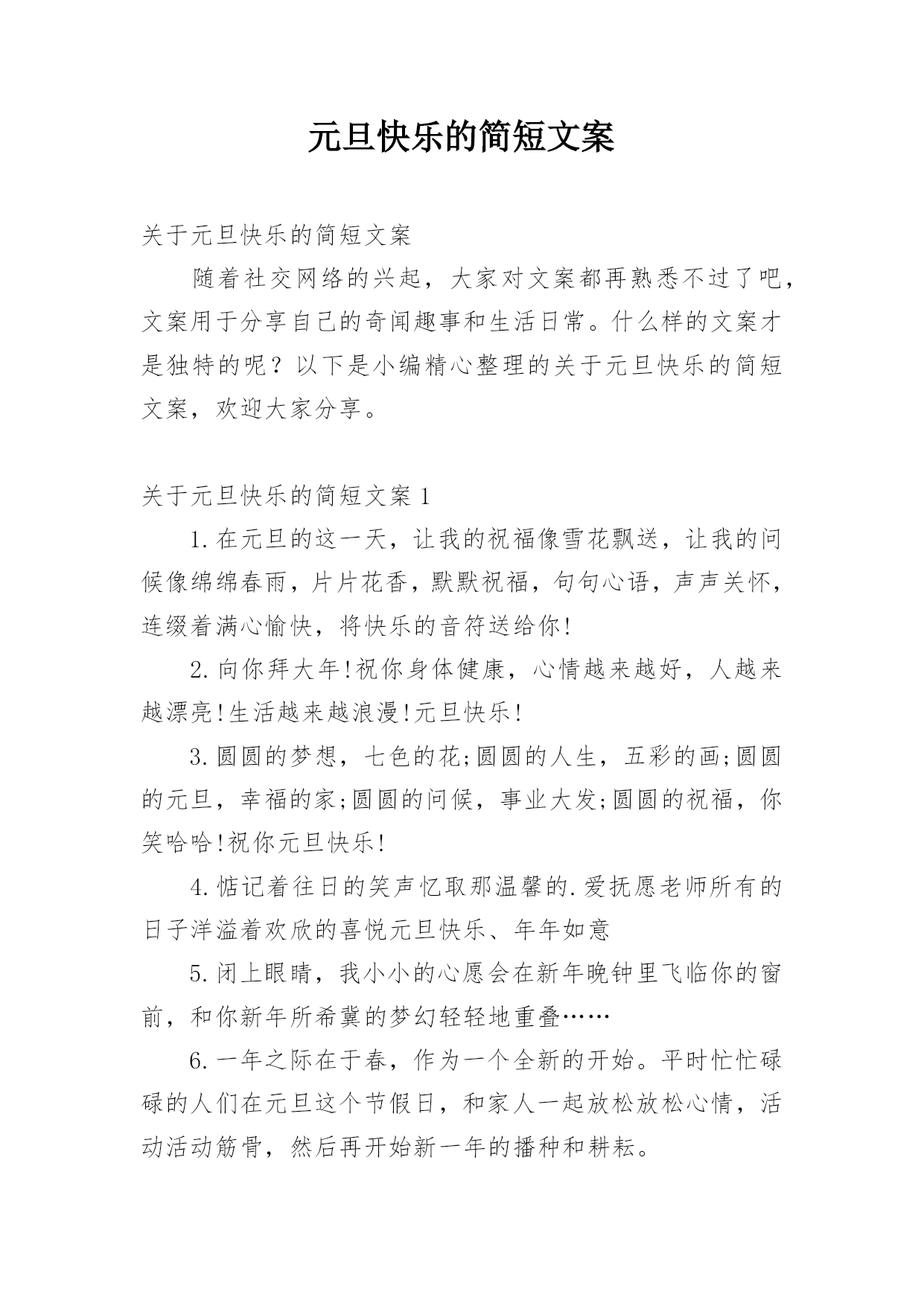元旦快乐的简短文案关于元旦快乐的简短文案随着社交网络的兴起,大家对文案都再熟悉不过了吧,文案用于分享自己的奇闻趣事和生活日常。什么样的文案才是独特的呢?以下是小编精心整理的关于元旦快乐的简短文案,欢迎大家分享。关于元旦快乐的简短文案11.在元旦的这一天,让我的祝福像雪花飘送,让我的问候像绵绵春雨,片片花香,默默祝福,句句心语,声声关怀,连缀着满心愉快,将快乐的音符送给你!2.向你拜大年!祝你身体健康,心情越来越好,人越来越漂亮!生活越来越浪漫!元旦快乐!3.圆圆的梦想,七色的花;圆圆的人生,五彩的画;圆圆