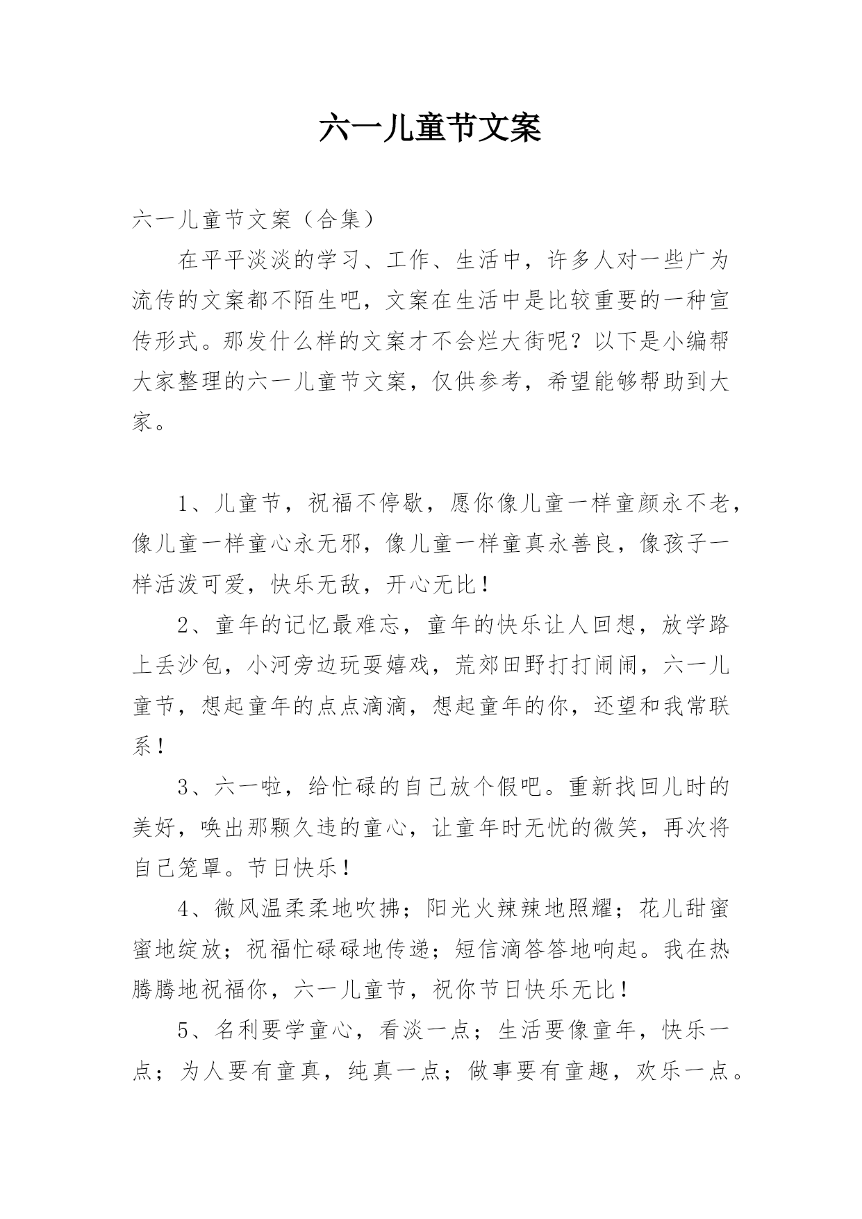 六一儿童节文案六一儿童节文案(合集)在平平淡淡的学习、工作、生活中,许多人对一些广为流传的文案都不陌生吧,文案在生活中是比较重要的一种宣传形式。那发什么样的文案才不会烂大街呢?以下是小编帮大家整理的六一儿童节文案,仅供参考,希望能够帮助到大家。1、儿童节,祝福不停歇,愿你像儿童一样童颜永不老,像儿童一样童心永无邪,像儿童一样童真永善良,像孩子一样活泼可爱,快乐无敌,开心无比!2、童年的记忆最难忘,童年的快乐让人回想,放学路上丢沙包,小河旁边玩耍嬉戏,荒郊田野打打闹闹,六一儿童节,想起童年的点点滴滴,想起童