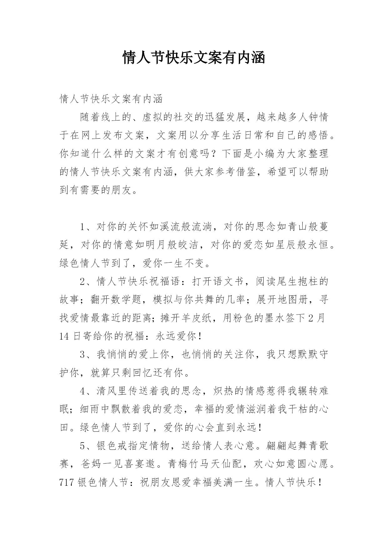 情人节快乐文案有内涵情人节快乐文案有内涵随着线上的、虚拟的社交的迅猛发展,越来越多人钟情于在网上发布文案,文案用以分享生活日常和自己的感悟。你知道什么样的文案才有创意吗?下面是小编为大家整理的情人节快乐文案有内涵,供大家参考借鉴,希望可以帮助到有需要的朋友。1、对你的关怀如溪流般流淌,对你的思念如青山般蔓延,对你的情意如明月般皎洁,对你的爱恋如星辰般永恒。绿色情人节到了,爱你一生不变。2、情人节快乐祝福语:打开语文书,阅读尾生抱柱的故事;翻开数学题,模拟与你共舞的几率;展开地图册,寻找爱情最靠近的距离;摊