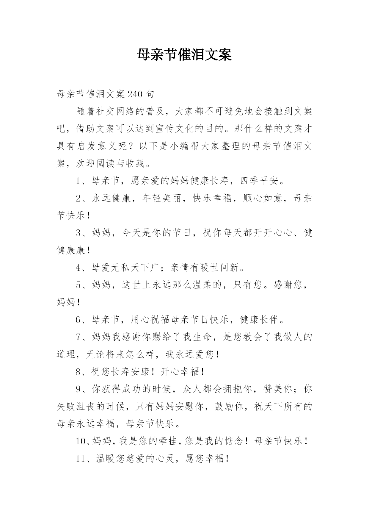 母亲节催泪文案母亲节催泪文案240句随着社交网络的普及,大家都不可避免地会接触到文案吧,借助文案可以达到宣传文化的目的。那什么样的文案才具有启发意义呢?以下是小编帮大家整理的母亲节催泪文案,欢迎阅读与收藏。1、母亲节,愿亲爱的妈妈健康长寿,四季平安。2、永远健康,年轻美丽,快乐幸福,顺心如意,母亲节快乐!3、妈妈,今天是你的节日,祝你每天都开开心心、健健康康!4、母爱无私天下广;亲情有暖世间新。5、妈妈,这世上永远那么温柔的,只有您。感谢您,妈妈!6、母亲节,用心祝福母亲节日快乐,健康长伴。7、妈妈我感谢