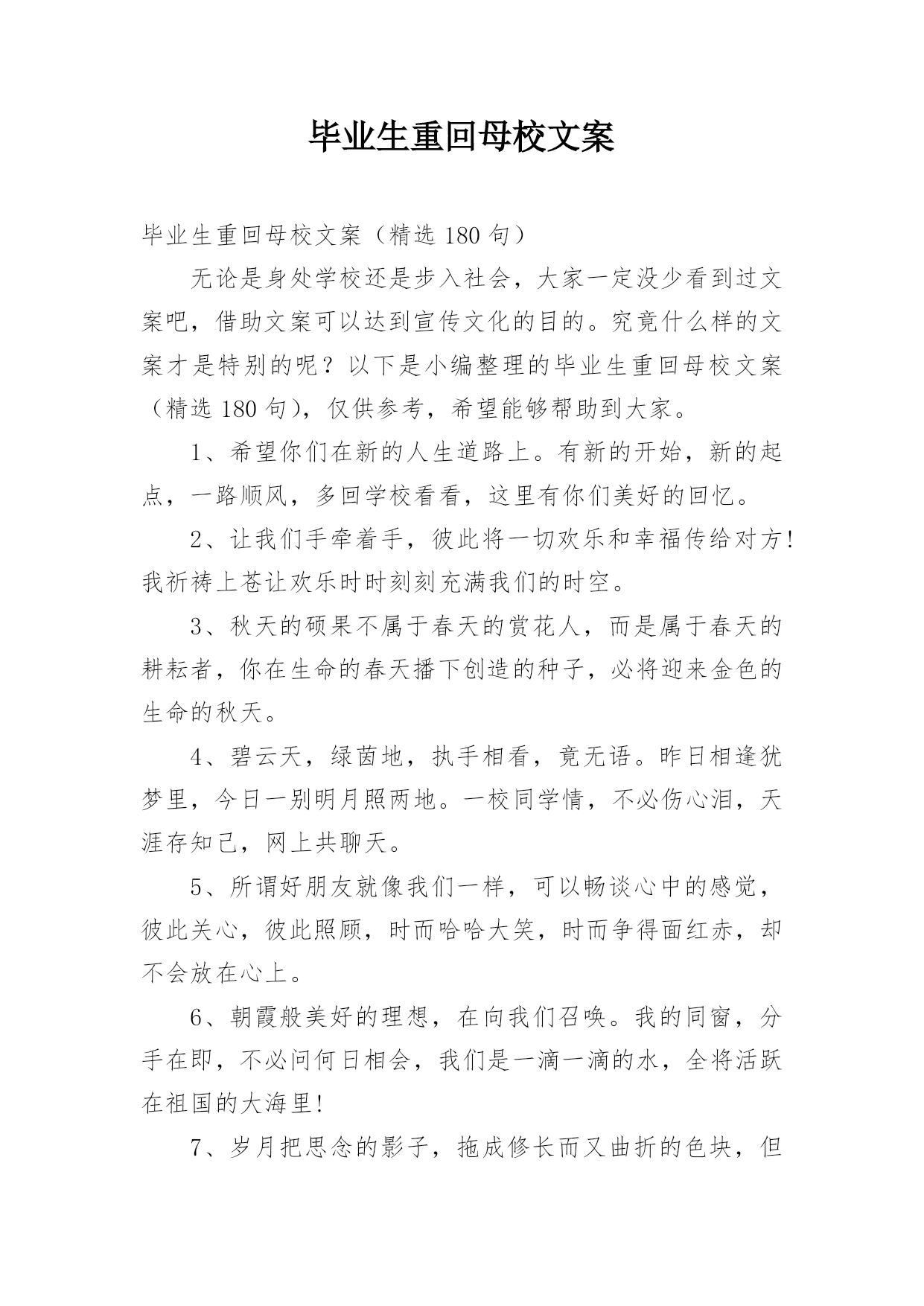 毕业生重回母校文案毕业生重回母校文案(精选180句)无论是身处学校还是步入社会,大家一定没少看到过文案吧,借助文案可以达到宣传文化的目的。究竟什么样的文案才是特别的呢?以下是小编整理的毕业生重回母校文案(精选180句),仅供参考,希望能够帮助到大家。1、希望你们在新的人生道路上。有新的开始,新的起点,一路顺风,多回学校看看,这里有你们美好的回忆。2、让我们手牵着手,彼此将一切欢乐和幸福传给对方!我祈祷上苍让欢乐时时刻刻充满我们的时空。3、秋天的硕果不属于春天的赏花人,而是属于春天的耕耘者,你在生命的春天播