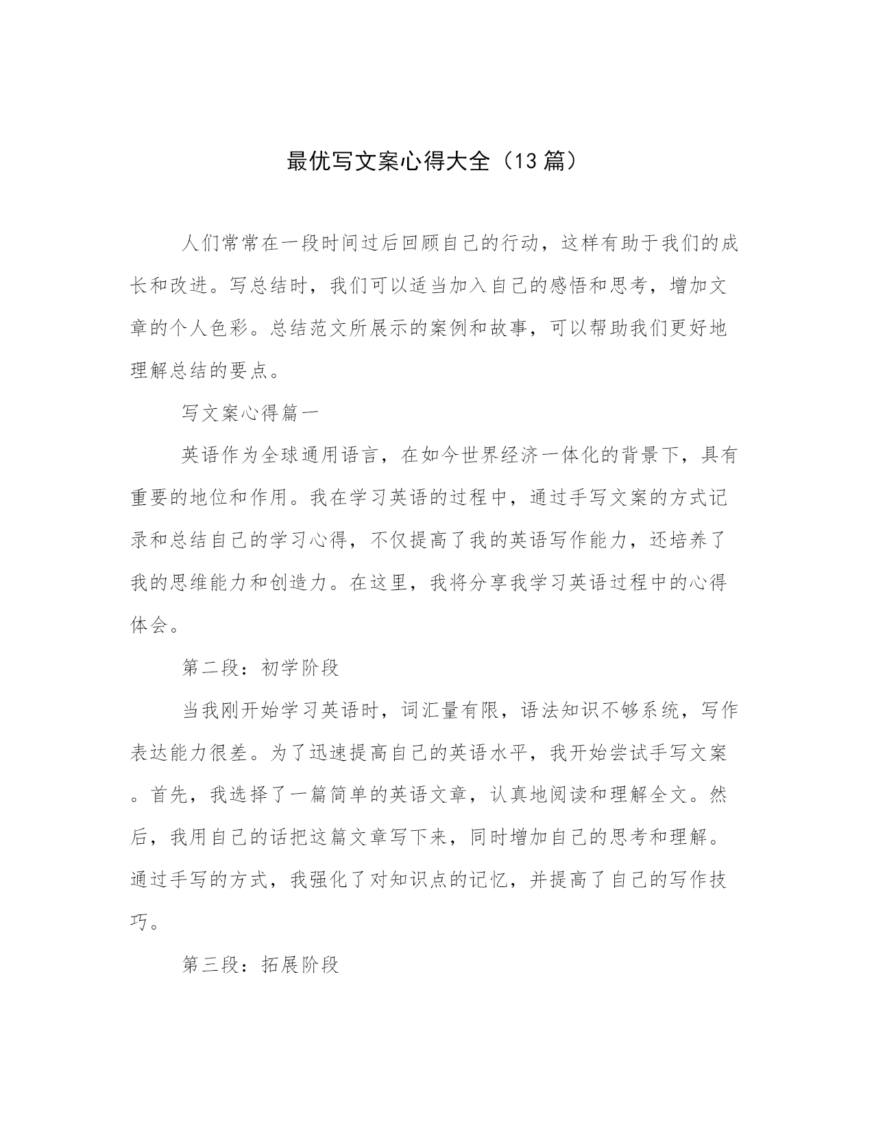 最优写文案心得大全(13篇)人们常常在一段时间过后回顾自己的行动,这样有助于我们的成长和改进。写总结时,我们可以适当加入自己的感悟和思考,增加文章的个人色彩。总结范文所展示的案例和故事,可以帮助我们更好地理解总结的要点。写文案心得篇一英语作为全球通用语言,在如今世界经济一体化的背景下,具有重要的地位和作用。我在学习英语的过程中,通过手写文案的方式记录和总结自己的学习心得,不仅提高了我的英语写作能力,还培养了我的思维能力和创造力。在这里,我将分享我学习英语过程中的心得体会。第二段:初学阶段当我刚开始学习英语