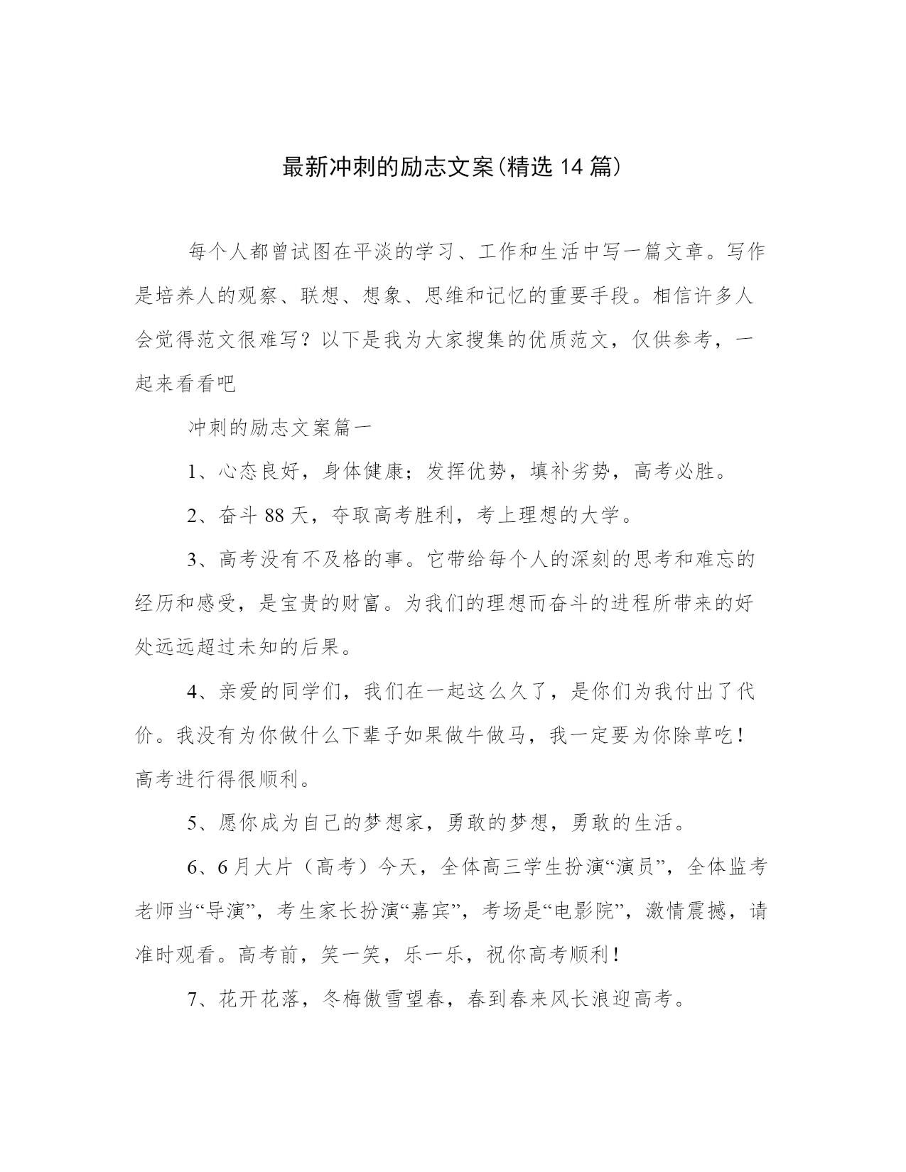 最新冲刺的励志文案(精选14篇)每个人都曾试图在平淡的学习、工作和生活中写一篇文章。写作是培养人的观察、联想、想象、思维和记忆的重要手段。相信许多人会觉得范文很难写?以下是我为大家搜集的优质范文,仅供参考,一起来看看吧冲刺的励志文案篇一1、心态良好,身体健康;发挥优势,填补劣势,高考必胜。2、奋斗88天,夺取高考胜利,考上理想的大学。3、高考没有不及格的事。它带给每个人的深刻的思考和难忘的经历和感受,是宝贵的财富。为我们的理想而奋斗的进程所带来的好处远远超过未知的后果。4、亲爱的同学们,我们在一起这么久了