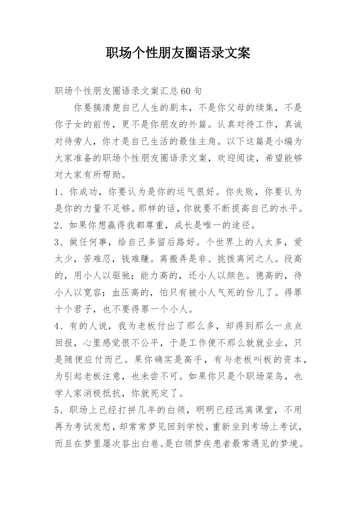 职场个性朋友圈语录文案职场个性朋友圈语录文案汇总60句你要搞清楚自己人生的剧本,不是你父母的续集,不是你子女的前传,更不是你朋友的外篇。认真对待工作,真诚对待旁人,你才是自己生活的最佳主角。以下这篇是小编为大家准备的职场个性朋友圈语录文案,欢迎阅读,希望能够对大家有所帮助。1、你成功,你要认为是你的运气很好。你失败,你要认为是你的力量不足够。那样的话,你就要不断提高自己的水平。2、如果你想赢得我都尊重,成长是唯一的途径。3、做任何事,给自己多留后路好。个世界上的人太多,爱太少,苦难忍,钱难赚。离搬弄是非、