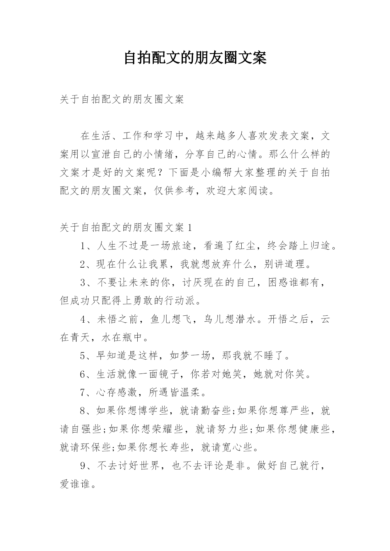 自拍配文的朋友圈文案关于自拍配文的朋友圈文案在生活、工作和学习中,越来越多人喜欢发表文案,文案用以宣泄自己的小情绪,分享自己的心情。那么什么样的文案才是好的文案呢?下面是小编帮大家整理的关于自拍配文的朋友圈文案,仅供参考,欢迎大家阅读。关于自拍配文的朋友圈文案11、人生不过是一场旅途,看遍了红尘,终会踏上归途。2、现在什么让我累,我就想放弃什么,别讲道理。3、不要让未来的你,讨厌现在的自己,困惑谁都有,但成功只配得上勇敢的行动派。4、未悟之前,鱼儿想飞,鸟儿想潜水。开悟之后,云在青天,水在瓶中。5、早知道