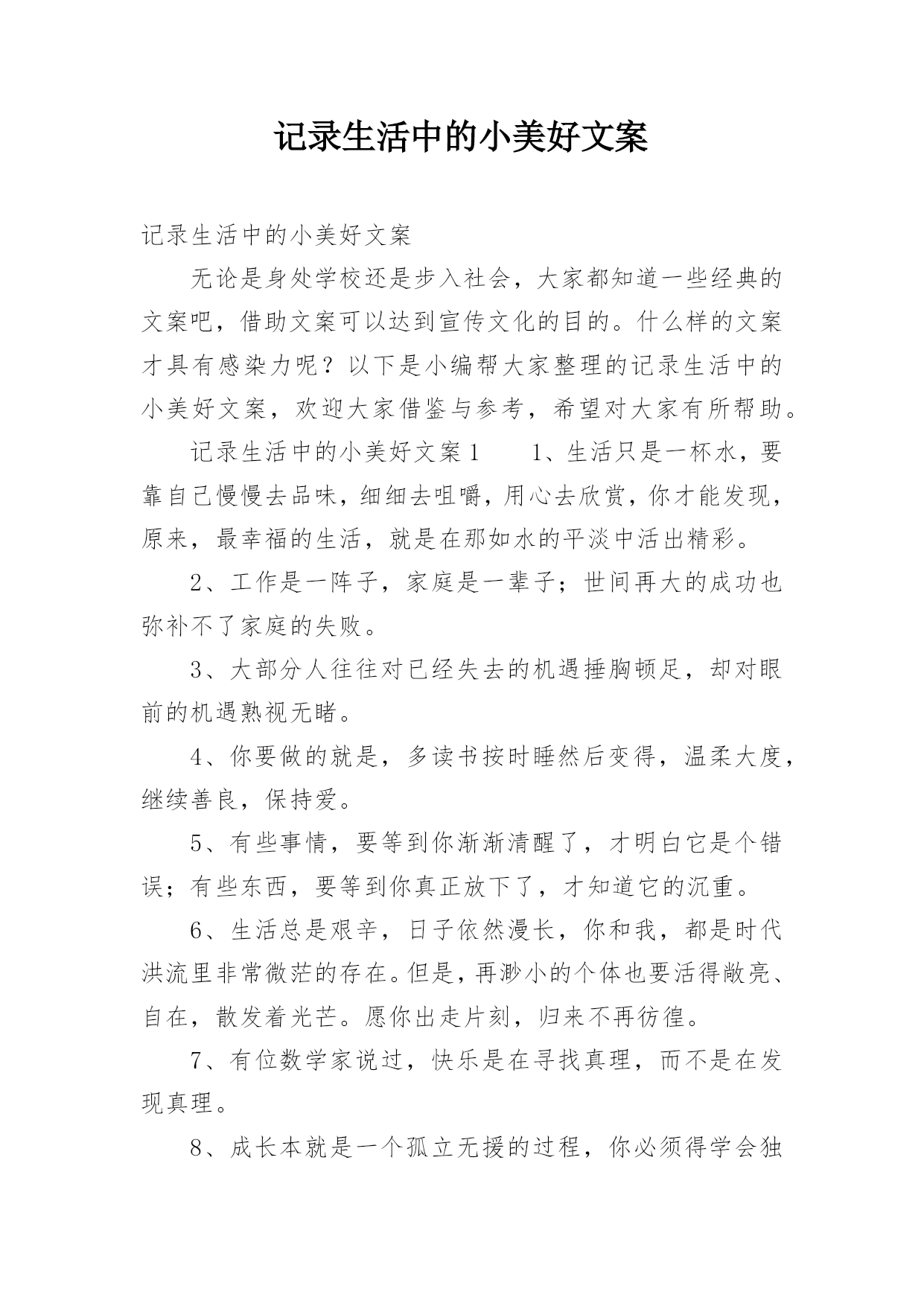 记录生活中的小美好文案记录生活中的小美好文案无论是身处学校还是步入社会,大家都知道一些经典的文案吧,借助文案可以达到宣传文化的目的。什么样的文案才具有感染力呢?以下是小编帮大家整理的记录生活中的小美好文案,欢迎大家借鉴与参考,希望对大家有所帮助。记录生活中的小美好文案11、生活只是一杯水,要靠自己慢慢去品味,细细去咀嚼,用心去欣赏,你才能发现,原来,最幸福的生活,就是在那如水的平淡中活出精彩。2、工作是一阵子,家庭是一辈子;世间再大的成功也弥补不了家庭的失败。3、大部分人往往对已经失去的机遇捶胸顿足,却对