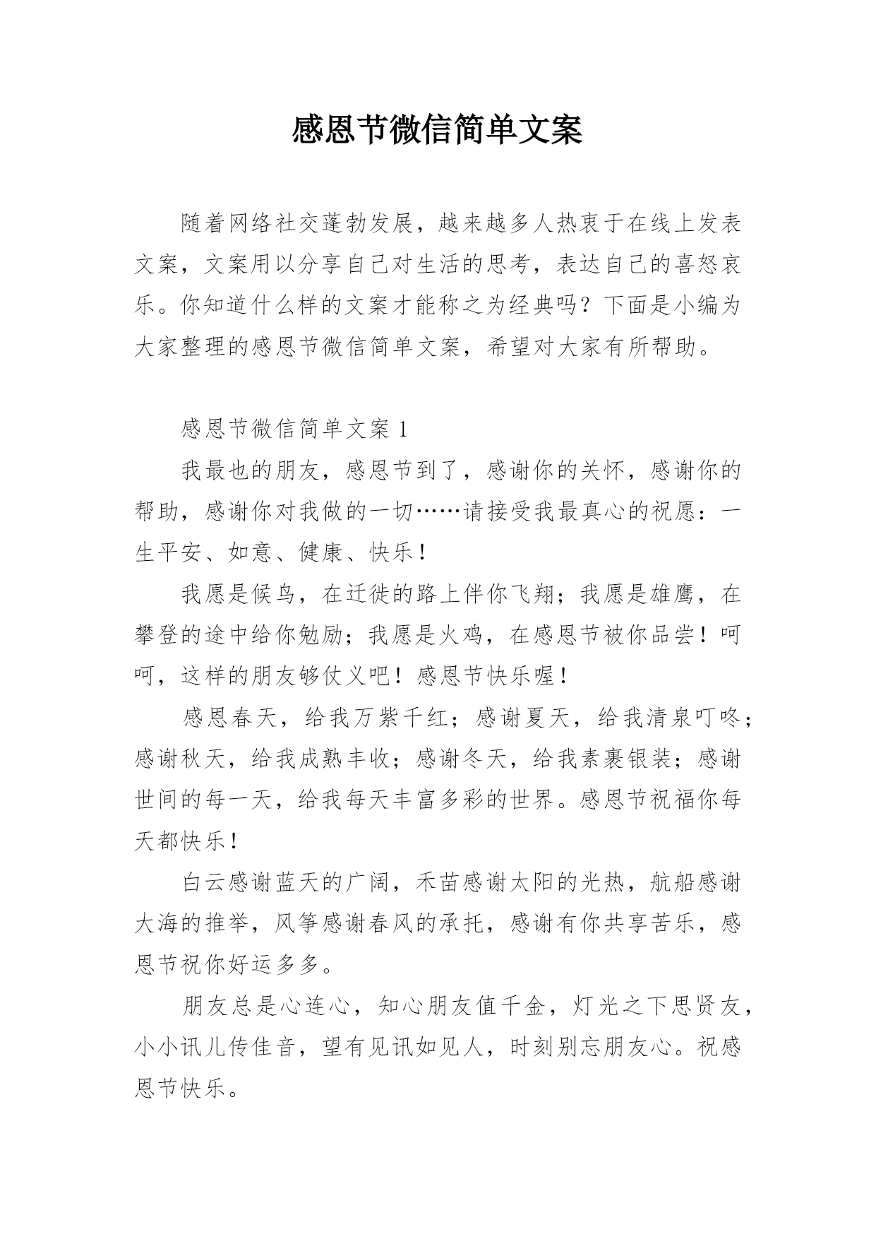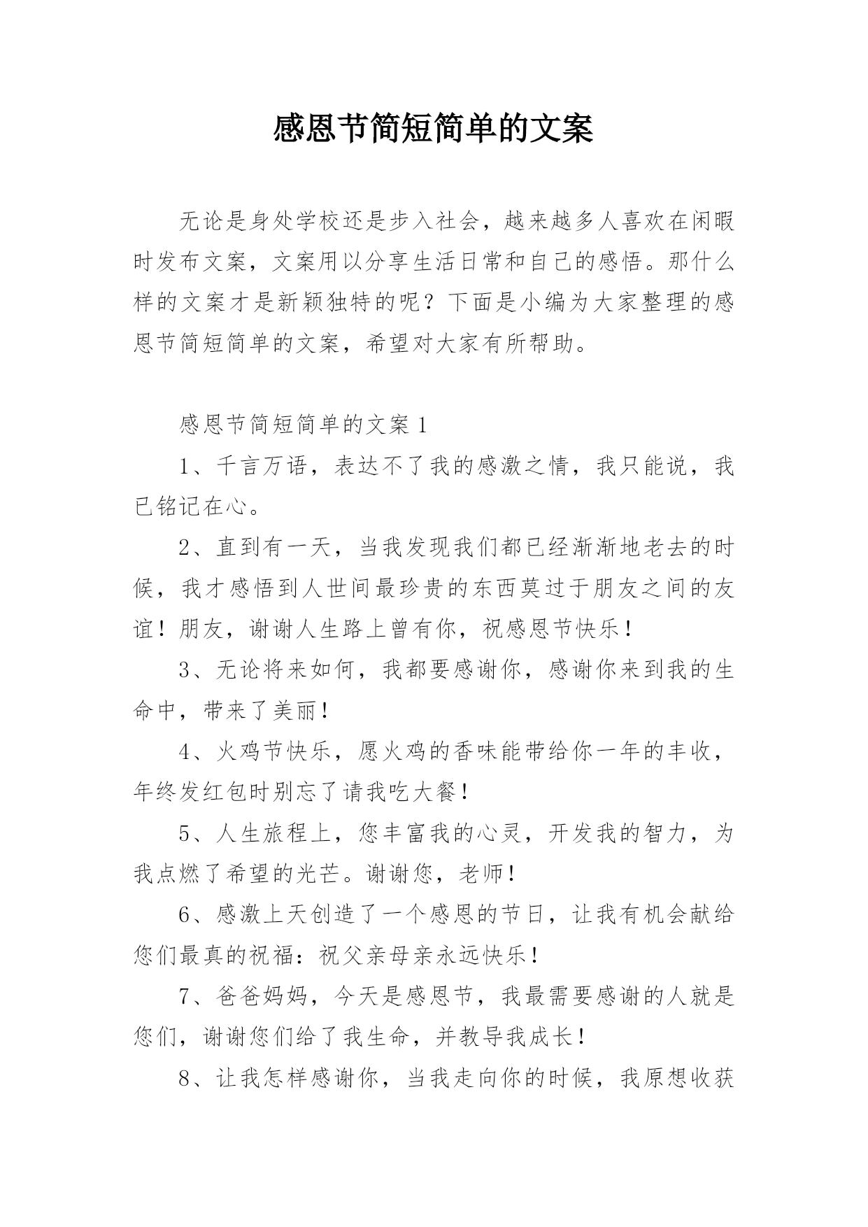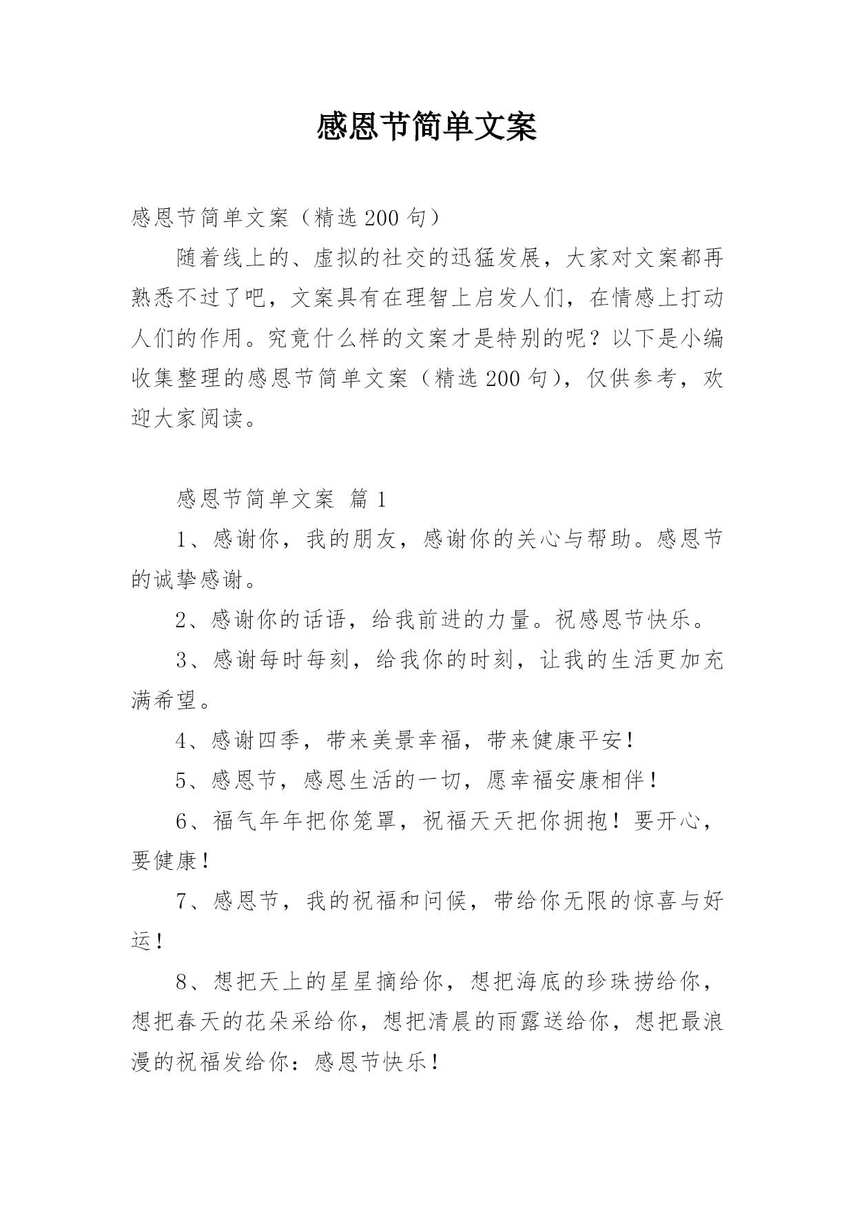 感恩节简单文案感恩节简单文案(精选200句)随着线上的、虚拟的社交的迅猛发展,大家对文案都再熟悉不过了吧,文案具有在理智上启发人们,在情感上打动人们的作用。究竟什么样的文案才是特别的呢?以下是小编收集整理的感恩节简单文案(精选200句),仅供参考,欢迎大家阅读。感恩节简单文案篇11、感谢你,我的朋友,感谢你的关心与帮助。感恩节的诚挚感谢。2、感谢你的话语,给我前进的力量。祝感恩节快乐。3、感谢每时每刻,给我你的时刻,让我的生活更加充满希望。4、感谢四季,带来美景幸福,带来健康平安!5、感恩节,感恩生活的一