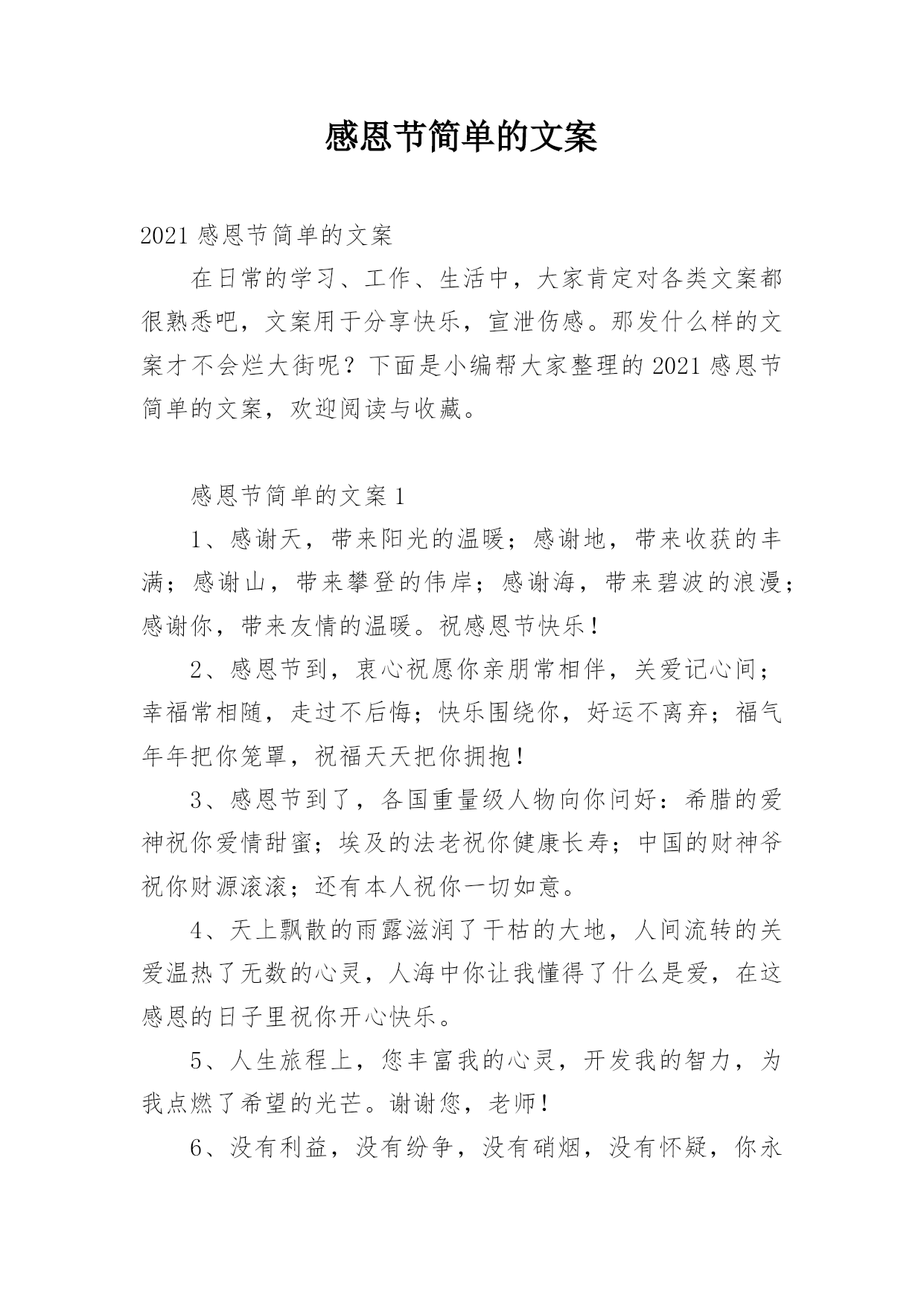 感恩节简单的文案2021感恩节简单的文案在日常的学习、工作、生活中,大家肯定对各类文案都很熟悉吧,文案用于分享快乐,宣泄伤感。那发什么样的文案才不会烂大街呢?下面是小编帮大家整理的2021感恩节简单的文案,欢迎阅读与收藏。感恩节简单的文案11、感谢天,带来阳光的温暖;感谢地,带来收获的丰满;感谢山,带来攀登的伟岸;感谢海,带来碧波的浪漫;感谢你,带来友情的温暖。祝感恩节快乐!2、感恩节到,衷心祝愿你亲朋常相伴,关爱记心间;幸福常相随,走过不后悔;快乐围绕你,好运不离弃;福气年年把你笼罩,祝福天天把你拥抱!