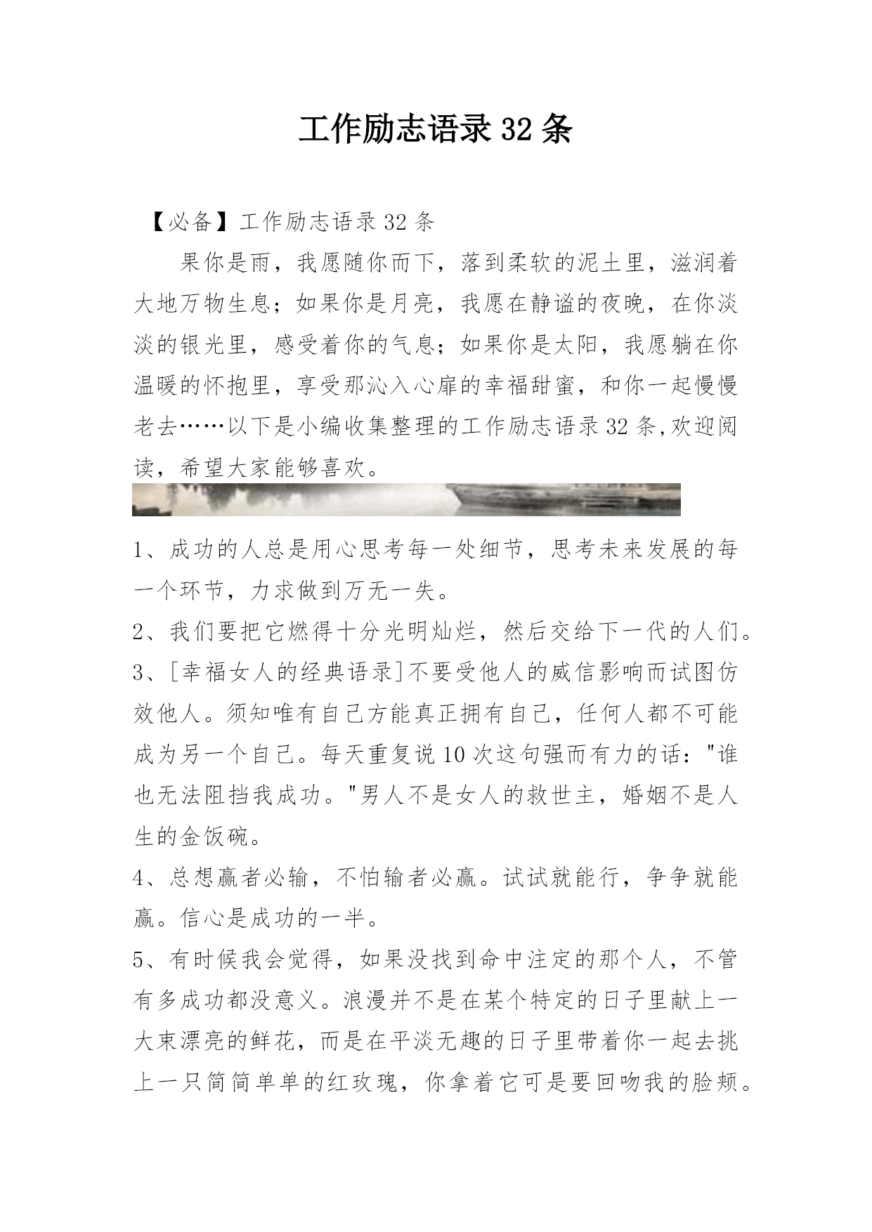 工作励志语录32条【必备】工作励志语录32条果你是雨,我愿随你而下,落到柔软的泥土里,滋润着大地万物生息;如果你是月亮,我愿在静谧的夜晚,在你淡淡的银光里,感受着你的气息;如果你是太阳,我愿躺在你温暖的怀抱里,享受那沁入心扉的幸福甜蜜,和你一起慢慢老去……以下是小编收集整理的工作励志语录32条,欢迎阅读,希望大家能够喜欢。1、成功的人总是用心思考每一处细节,思考未来发展的每一个环节,力求做到万无一失。2、我们要把它燃得十分光明灿烂,然后交给下一代的人们。3、[幸福女人的经典语录]不要受他人的威信影响而试图