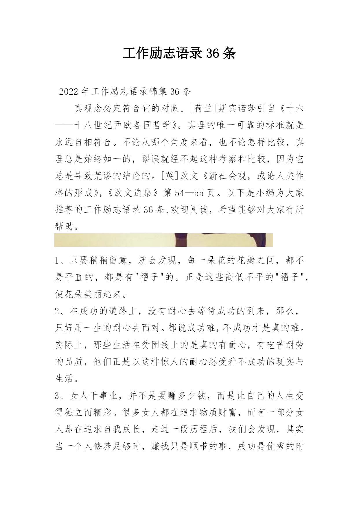 工作励志语录36条2022年工作励志语录锦集36条真观念必定符合它的对象。[荷兰]斯宾诺莎引自《十六——十八世纪西欧各国哲学》。真理的唯一可靠的标准就是永远自相符合。不论从哪个角度来看,也不论怎样比较,真理总是始终如一的,谬误就经不起这种考察和比较,因为它总是导致荒谬的结论的。[英]欧文《新社会观,或论人类性格的形成》,《欧文选集》第54—55页。以下是小编为大家推荐的工作励志语录36条,欢迎阅读,希望能够对大家有所帮助。1、只要稍稍留意,就会发现,每一朵花的花瓣之间,都不是平直的,都是有"褶子"的。正是