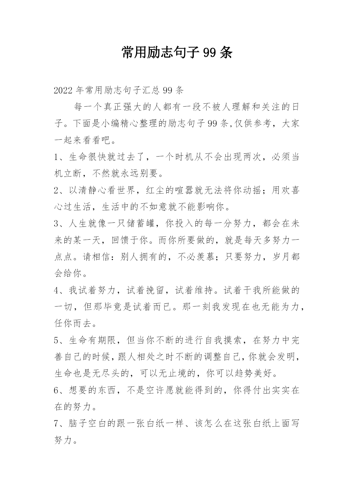 常用励志句子99条2022年常用励志句子汇总99条每一个真正强大的人都有一段不被人理解和关注的日子。下面是小编精心整理的励志句子99条,仅供参考,大家一起来看看吧。1、生命很快就过去了,一个时机从不会出现两次,必须当机立断,不然就永远别要。2、以清静心看世界,红尘的喧嚣就无法将你动摇;用欢喜心过生活,生活中的不如意就不能影响你。3、人生就像一只储蓄罐,你投入的每一分努力,都会在未来的某一天,回馈于你。而你所要做的,就是每天多努力一点点。请相信:别人拥有的,不必羡慕;只要努力,岁月都会给你。4、我试着努力,