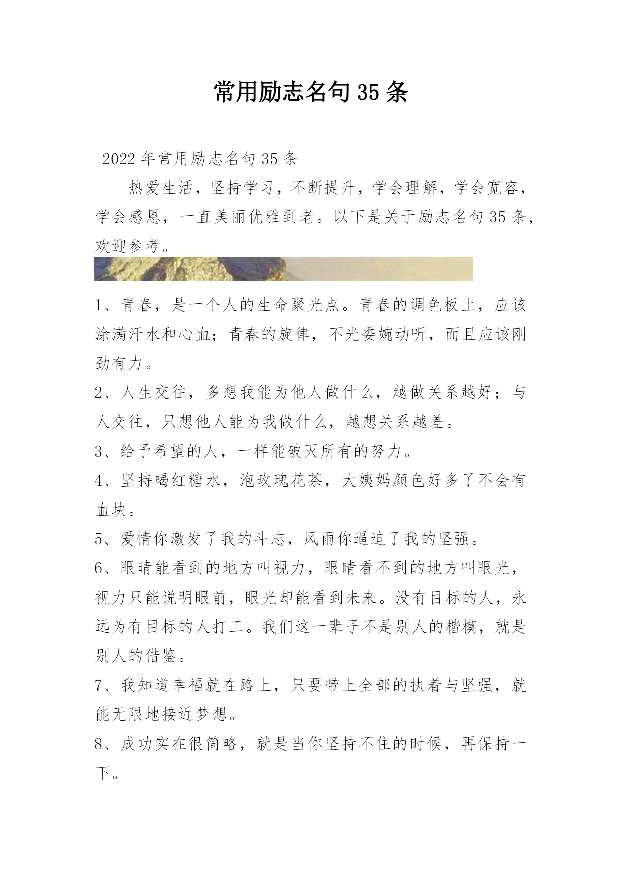 常用励志名句35条2022年常用励志名句35条热爱生活,坚持学习,不断提升,学会理解,学会宽容,学会感恩,一直美丽优雅到老。以下是关于励志名句35条,欢迎参考。1、青春,是一个人的生命聚光点。青春的调色板上,应该涂满汗水和心血;青春的旋律,不光委婉动听,而且应该刚劲有力。2、人生交往,多想我能为他人做什么,越做关系越好;与人交往,只想他人能为我做什么,越想关系越差。3、给予希望的人,一样能破灭所有的努力。4、坚持喝红糖水,泡玫瑰花茶,大姨妈颜色好多了不会有血块。5、爱情你激发了我的斗志,风雨你逼迫了我的坚