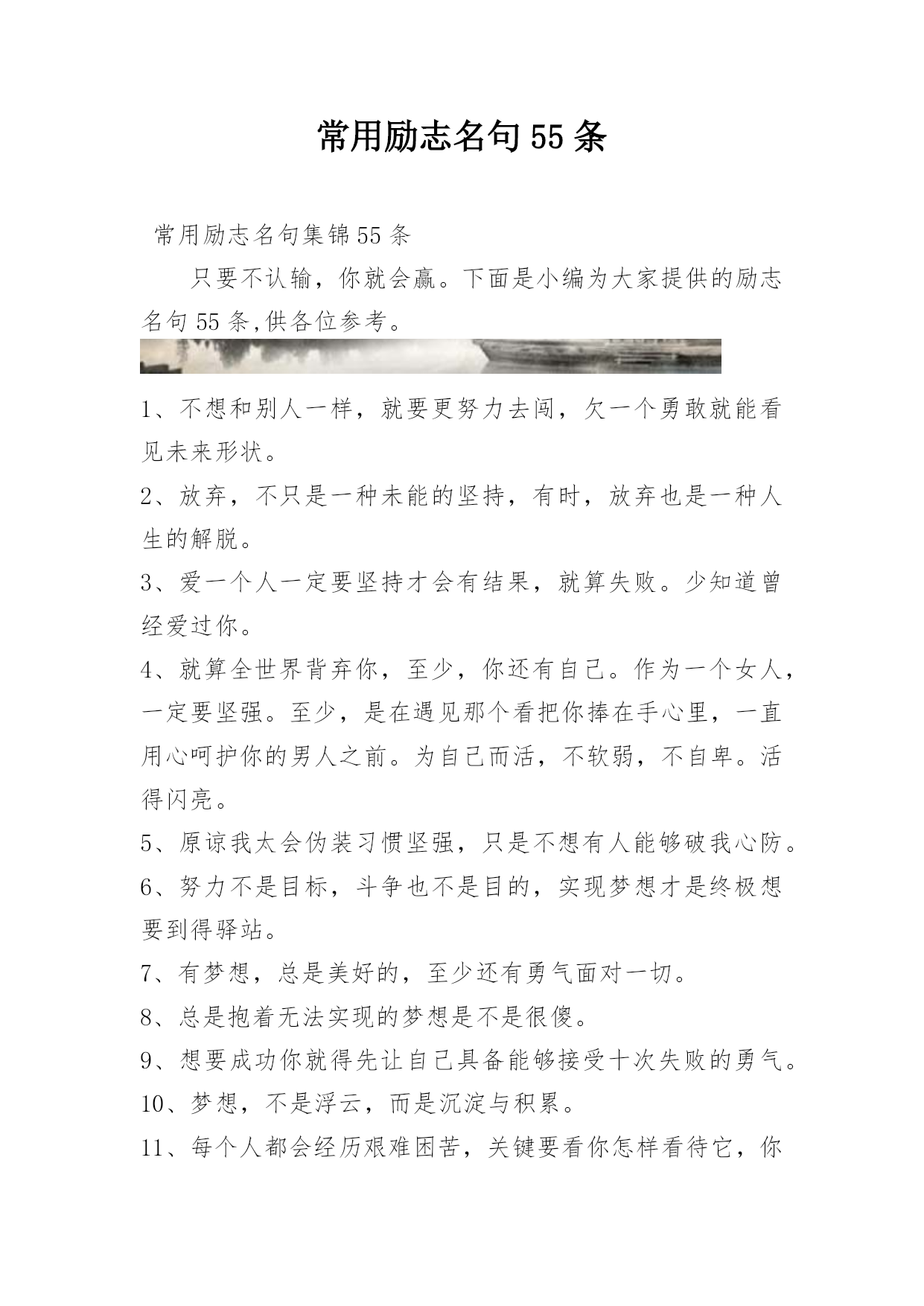 常用励志名句55条常用励志名句集锦55条只要不认输,你就会赢。下面是小编为大家提供的励志名句55条,供各位参考。1、不想和别人一样,就要更努力去闯,欠一个勇敢就能看见未来形状。2、放弃,不只是一种未能的坚持,有时,放弃也是一种人生的解脱。3、爱一个人一定要坚持才会有结果,就算失败。少知道曾经爱过你。4、就算全世界背弃你,至少,你还有自己。作为一个女人,一定要坚强。至少,是在遇见那个看把你捧在手心里,一直用心呵护你的男人之前。为自己而活,不软弱,不自卑。活得闪亮。5、原谅我太会伪装习惯坚强,只是不想有人能够