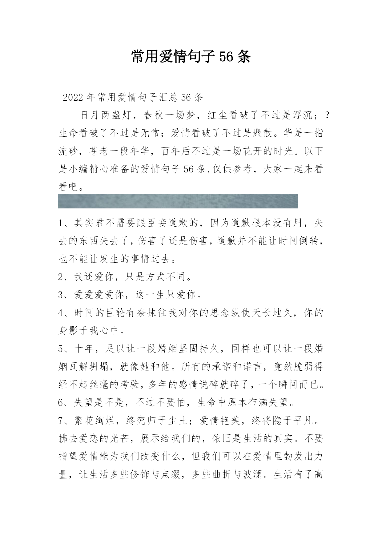 常用爱情句子56条2022年常用爱情句子汇总56条日月两盏灯,春秋一场梦,红尘看破了不过是浮沉;?生命看破了不过是无常;爱情看破了不过是聚散。华是一指流砂,苍老一段年华,百年后不过是一场花开的时光。以下是小编精心准备的爱情句子56条,仅供参考,大家一起来看看吧。1、其实君不需要跟臣妾道歉的,因为道歉根本没有用,失去的东西失去了,伤害了还是伤害,道歉并不能让时间倒转,也不能让发生的事情过去。2、我还爱你,只是方式不同。3、爱爱爱爱你,这一生只爱你。4、时间的巨轮有奈抹往我对你的思念纵使天长地久,你的身影于我