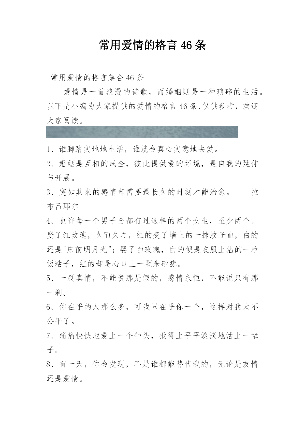 常用爱情的格言46条常用爱情的格言集合46条爱情是一首浪漫的诗歌,而婚姻则是一种琐碎的生活。以下是小编为大家提供的爱情的格言46条,仅供参考,欢迎大家阅读。1、谁脚踏实地地生活,谁就会真心实意地去爱。2、婚姻是互相的成全,彼此提供爱的环境,是自我的延伸与开展。3、突如其来的感情却需要最长久的时刻才能治愈。——拉布吕耶尔4、也许每一个男子全都有过这样的两个女生,至少两个。娶了红玫瑰,久而久之,红的变了墙上的一抹蚊子血,白的还是"床前明月光";娶了白玫瑰,白的便是衣服上沾的一粒饭粘子,红的却是心口上一颗朱砂痣