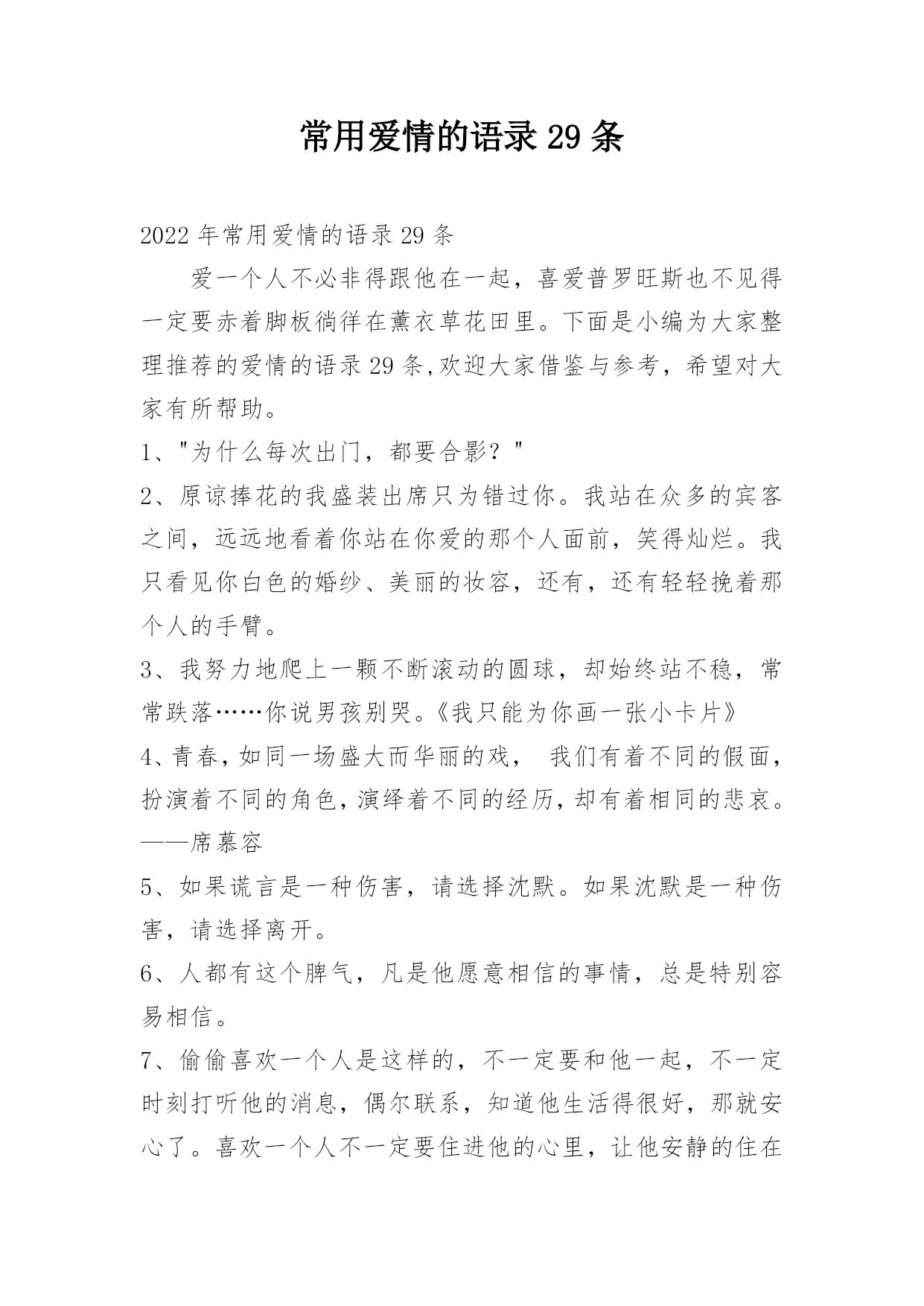 常用爱情的语录29条2022年常用爱情的语录29条爱一个人不必非得跟他在一起,喜爱普罗旺斯也不见得一定要赤着脚板徜徉在薰衣草花田里。下面是小编为大家整理推荐的爱情的语录29条,欢迎大家借鉴与参考,希望对大家有所帮助。1、"为什么每次出门,都要合影?"2、原谅捧花的我盛装出席只为错过你。我站在众多的宾客之间,远远地看着你站在你爱的那个人面前,笑得灿烂。我只看见你白色的婚纱、美丽的妆容,还有,还有轻轻挽着那个人的手臂。3、我努力地爬上一颗不断滚动的圆球,却始终站不稳,常常跌落……你说男孩别哭。《我只能为你画一