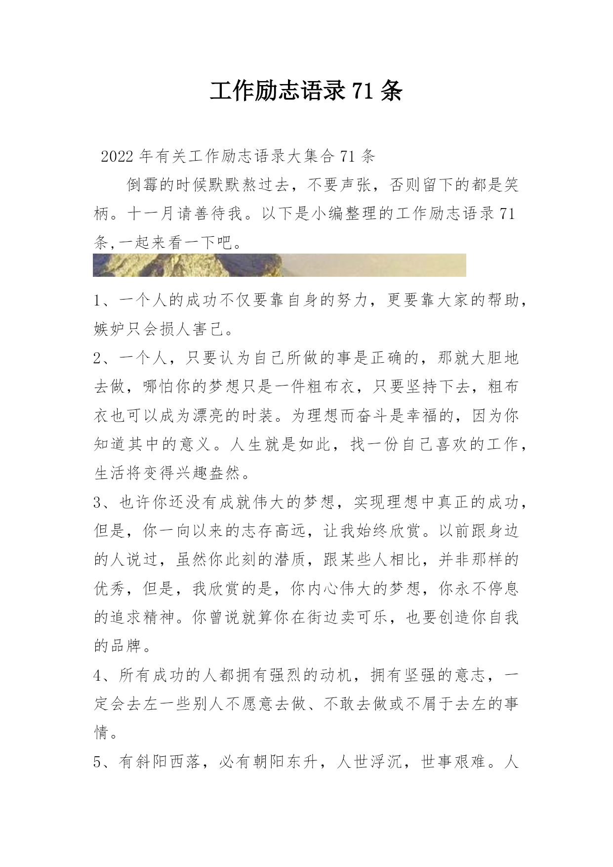 工作励志语录71条2022年有关工作励志语录大集合71条倒霉的时候默默熬过去,不要声张,否则留下的都是笑柄。十一月请善待我。以下是小编整理的工作励志语录71条,一起来看一下吧。1、一个人的成功不仅要靠自身的努力,更要靠大家的帮助,嫉妒只会损人害己。2、一个人,只要认为自己所做的事是正确的,那就大胆地去做,哪怕你的梦想只是一件粗布衣,只要坚持下去,粗布衣也可以成为漂亮的时装。为理想而奋斗是幸福的,因为你知道其中的意义。人生就是如此,找一份自己喜欢的工作,生活将变得兴趣盎然。3、也许你还没有成就伟大的梦想,实