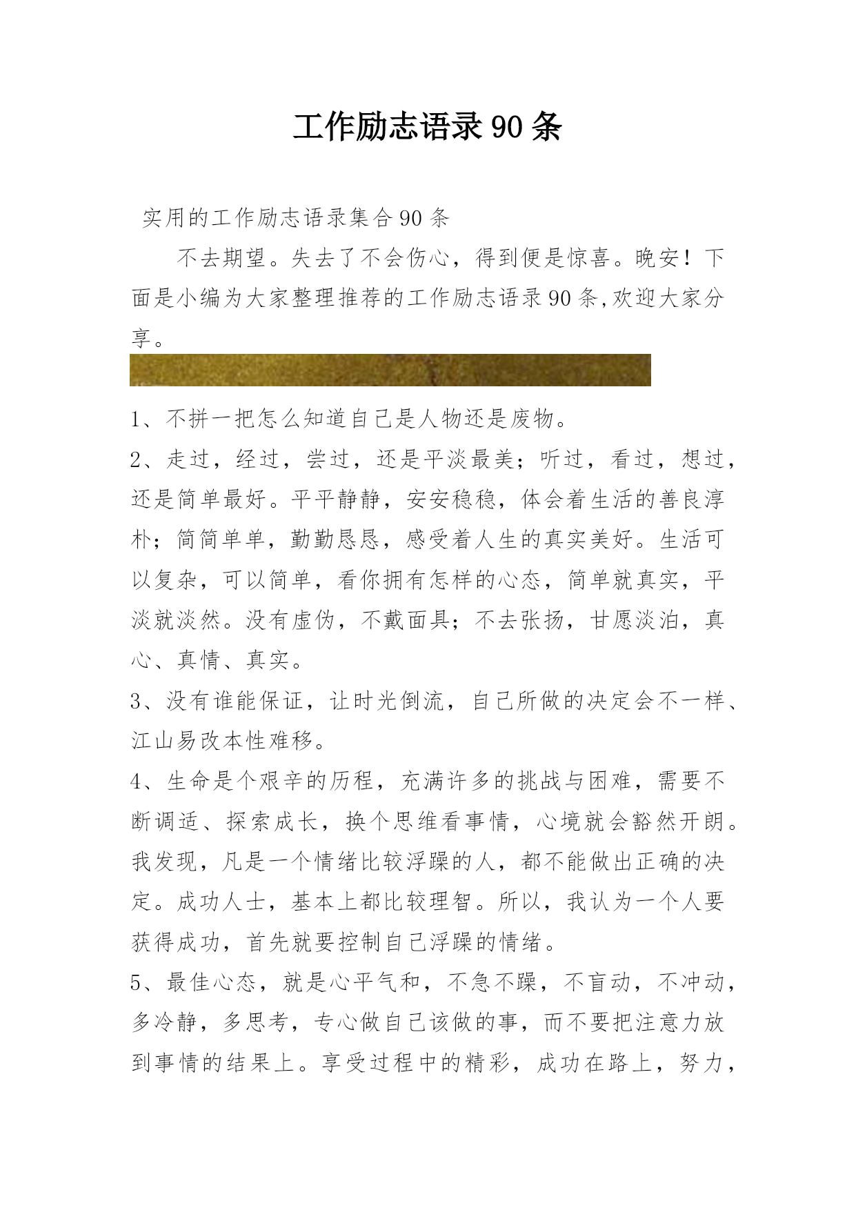 工作励志语录90条实用的工作励志语录集合90条不去期望。失去了不会伤心,得到便是惊喜。晚安!下面是小编为大家整理推荐的工作励志语录90条,欢迎大家分享。1、不拼一把怎么知道自己是人物还是废物。2、走过,经过,尝过,还是平淡最美;听过,看过,想过,还是简单最好。平平静静,安安稳稳,体会着生活的善良淳朴;简简单单,勤勤恳恳,感受着人生的真实美好。生活可以复杂,可以简单,看你拥有怎样的心态,简单就真实,平淡就淡然。没有虚伪,不戴面具;不去张扬,甘愿淡泊,真心、真情、真实。3、没有谁能保证,让时光倒流,自己所做的