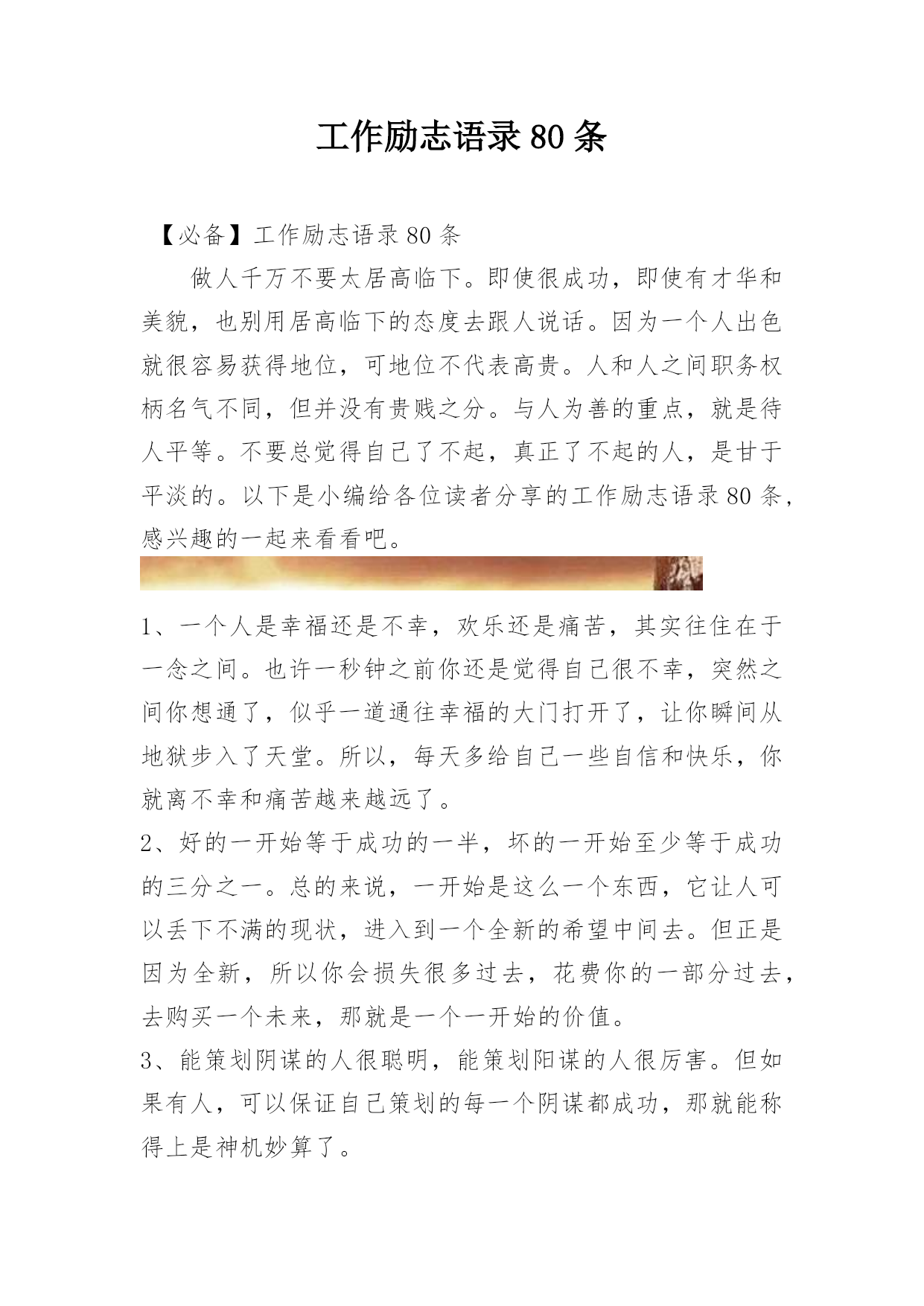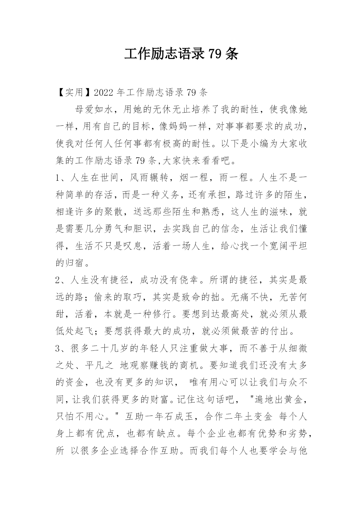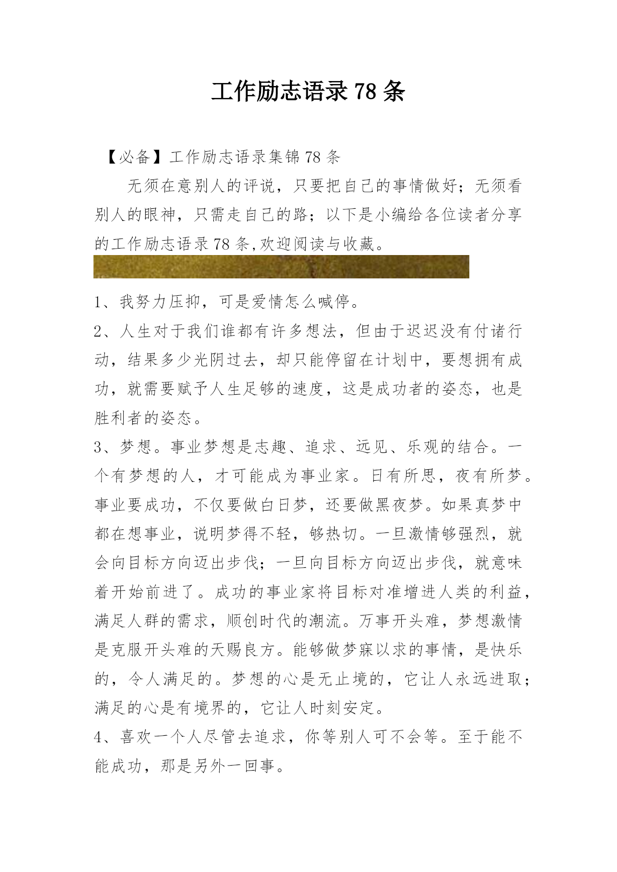 工作励志语录78条【必备】工作励志语录集锦78条无须在意别人的评说,只要把自己的事情做好;无须看别人的眼神,只需走自己的路;以下是小编给各位读者分享的工作励志语录78条,欢迎阅读与收藏。1、我努力压抑,可是爱情怎么喊停。2、人生对于我们谁都有许多想法,但由于迟迟没有付诸行动,结果多少光阴过去,却只能停留在计划中,要想拥有成功,就需要赋予人生足够的速度,这是成功者的姿态,也是胜利者的姿态。3、梦想。事业梦想是志趣、追求、远见、乐观的结合。一个有梦想的人,才可能成为事业家。日有所思,夜有所梦。事业要成功,不仅