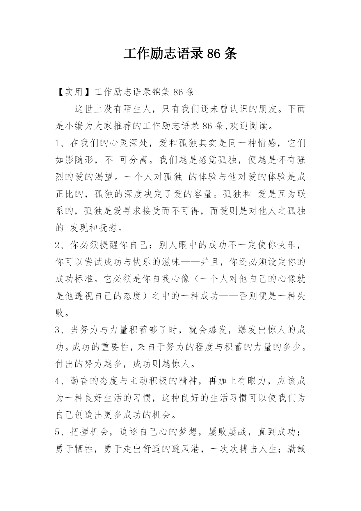工作励志语录86条【实用】工作励志语录锦集86条这世上没有陌生人,只有我们还未曾认识的朋友。下面是小编为大家推荐的工作励志语录86条,欢迎阅读。1、在我们的心灵深处,爱和孤独其实是同一种情感,它们如影随形,不可分离。我们越是感觉孤独,便越是怀有强烈的爱的渴望。一个人对孤独的体验与他对爱的体验是成正比的,孤独的深度决定了爱的容量。孤独和爱是互为联系的,孤独是爱寻求接受而不可得,而爱则是对他人之孤独的发现和抚慰。2、你必须提醒你自己:别人眼中的成功不一定使你快乐,你可以尝试成功与快乐的滋味——并且,你还必须设