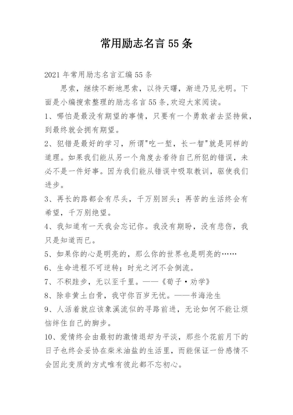常用励志名言55条2021年常用励志名言汇编55条思索,继续不断地思索,以待天曙,渐进乃见光明。下面是小编搜索整理的励志名言55条,欢迎大家阅读。1、哪怕是最没有期望的事情,只要有一个勇敢者去坚持做,到最终就会拥有期望。2、犯错是最好的学习,所谓"吃一堑,长一智"就是同样的道理。如果我们能从另一个角度去看待自己所犯的错误,未必不是一件好事。因为我们能从错误中吸取教训,驱使我们进步。3、再长的路都会有尽头,千万别回头;再苦的生活终会有希望,千万别绝望。4、我知道有一天我会忘记你。我没有期盼,没有悲伤,我只是