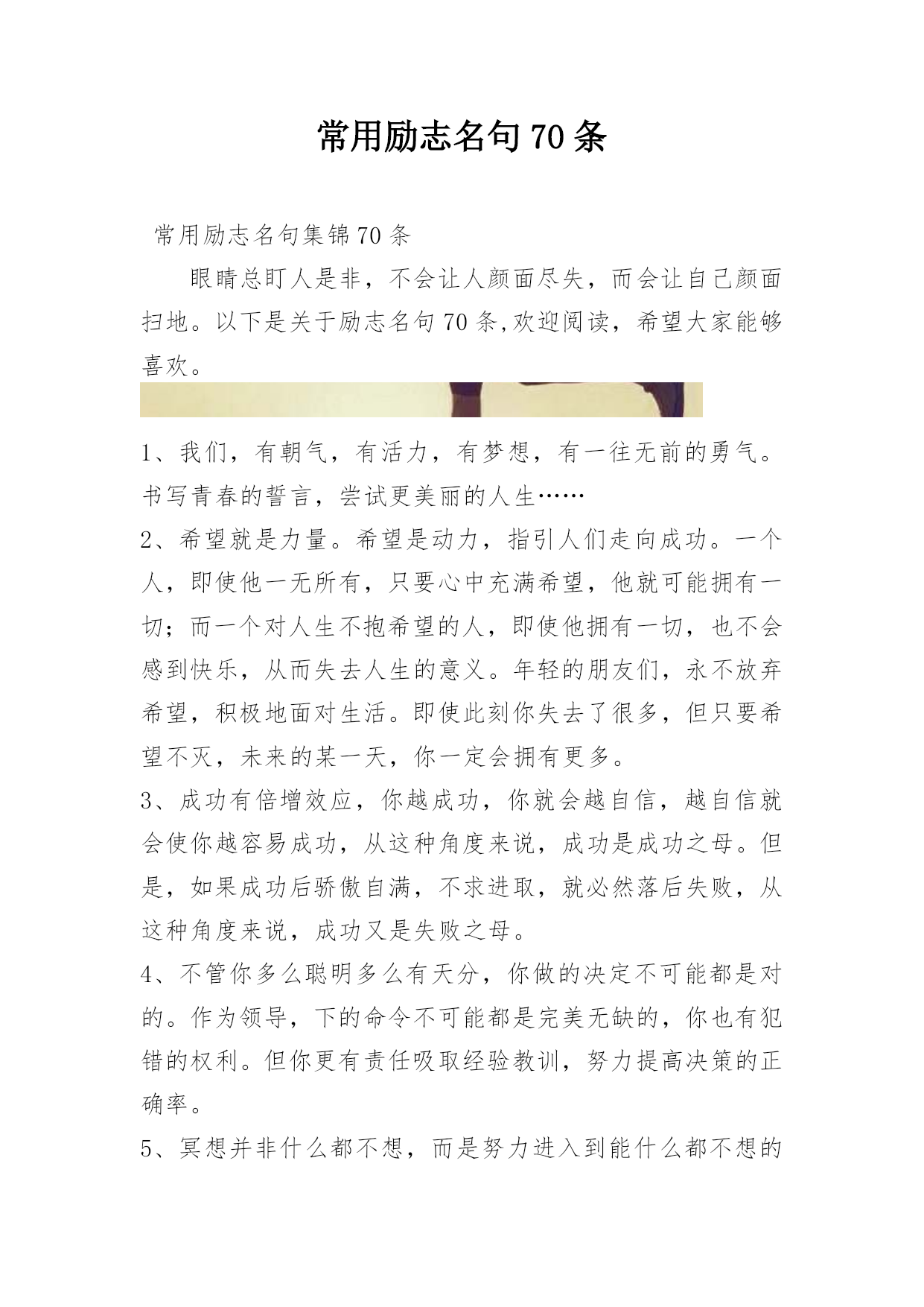 常用励志名句70条常用励志名句集锦70条眼睛总盯人是非,不会让人颜面尽失,而会让自己颜面扫地。以下是关于励志名句70条,欢迎阅读,希望大家能够喜欢。1、我们,有朝气,有活力,有梦想,有一往无前的勇气。书写青春的誓言,尝试更美丽的人生……2、希望就是力量。希望是动力,指引人们走向成功。一个人,即使他一无所有,只要心中充满希望,他就可能拥有一切;而一个对人生不抱希望的人,即使他拥有一切,也不会感到快乐,从而失去人生的意义。年轻的朋友们,永不放弃希望,积极地面对生活。即使此刻你失去了很多,但只要希望不灭,未来的