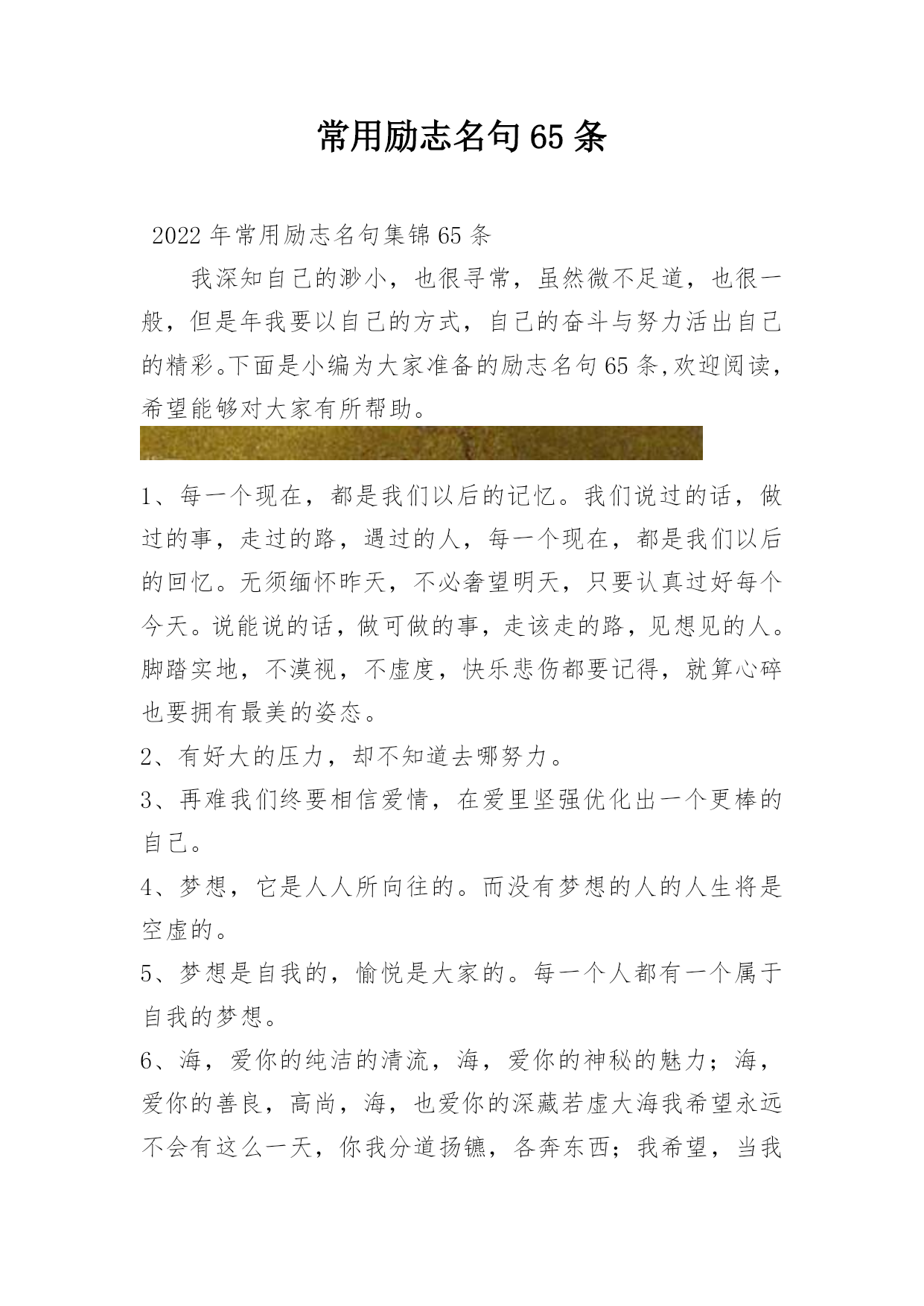 常用励志名句65条2022年常用励志名句集锦65条我深知自己的渺小,也很寻常,虽然微不足道,也很一般,但是年我要以自己的方式,自己的奋斗与努力活出自己的精彩。下面是小编为大家准备的励志名句65条,欢迎阅读,希望能够对大家有所帮助。1、每一个现在,都是我们以后的记忆。我们说过的话,做过的事,走过的路,遇过的人,每一个现在,都是我们以后的回忆。无须缅怀昨天,不必奢望明天,只要认真过好每个今天。说能说的话,做可做的事,走该走的路,见想见的人。脚踏实地,不漠视,不虚度,快乐悲伤都要记得,就算心碎也要拥有最美的姿态