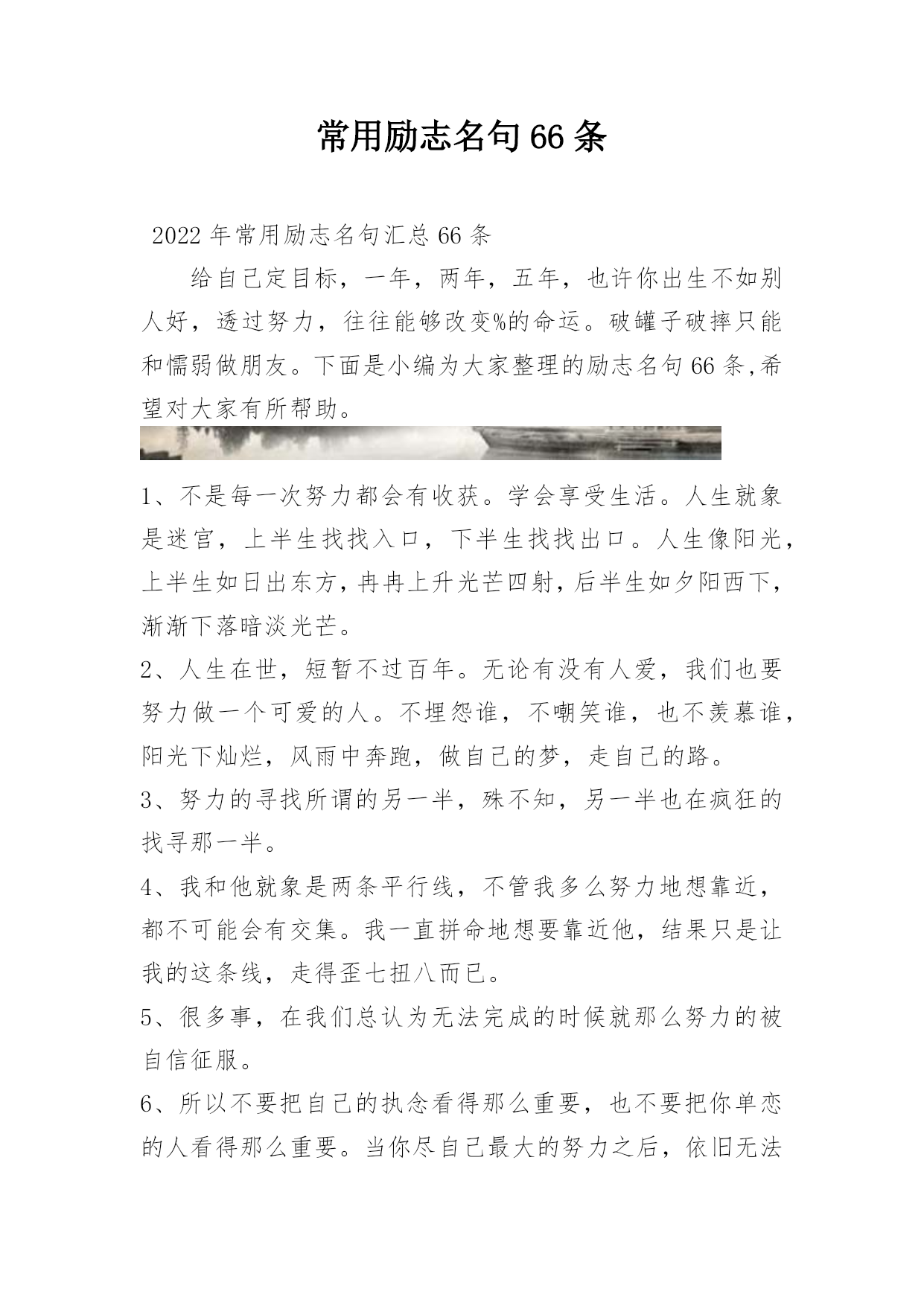 常用励志名句66条2022年常用励志名句汇总66条给自己定目标,一年,两年,五年,也许你出生不如别人好,透过努力,往往能够改变%的命运。破罐子破摔只能和懦弱做朋友。下面是小编为大家整理的励志名句66条,希望对大家有所帮助。1、不是每一次努力都会有收获。学会享受生活。人生就象是迷宫,上半生找找入口,下半生找找出口。人生像阳光,上半生如日出东方,冉冉上升光芒四射,后半生如夕阳西下,渐渐下落暗淡光芒。2、人生在世,短暂不过百年。无论有没有人爱,我们也要努力做一个可爱的人。不埋怨谁,不嘲笑谁,也不羡慕谁,阳光下灿