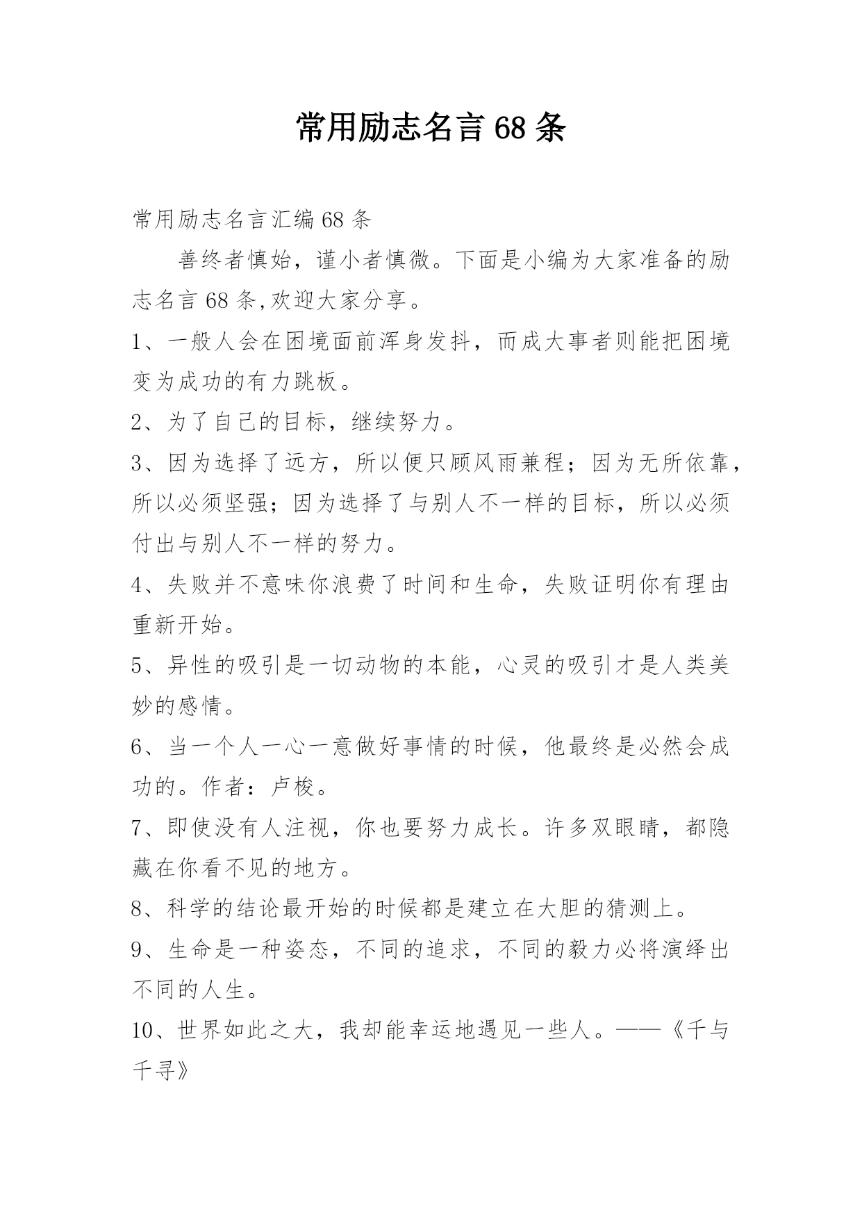 常用励志名言68条常用励志名言汇编68条善终者慎始,谨小者慎微。下面是小编为大家准备的励志名言68条,欢迎大家分享。1、一般人会在困境面前浑身发抖,而成大事者则能把困境变为成功的有力跳板。2、为了自己的目标,继续努力。3、因为选择了远方,所以便只顾风雨兼程;因为无所依靠,所以必须坚强;因为选择了与别人不一样的目标,所以必须付出与别人不一样的努力。4、失败并不意味你浪费了时间和生命,失败证明你有理由重新开始。5、异性的吸引是一切动物的本能,心灵的吸引才是人类美妙的感情。6、当一个人一心一意做好事情的时候,他
