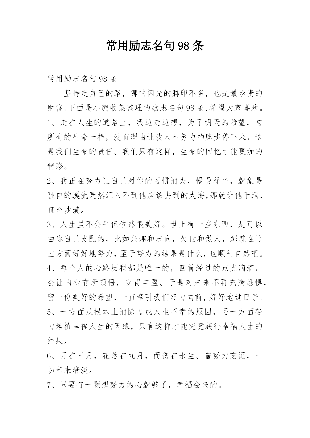 常用励志名句98条常用励志名句98条坚持走自己的路,哪怕闪光的脚印不多,也是最珍贵的财富。下面是小编收集整理的励志名句98条,希望大家喜欢。1、走在人生的道路上,我边走边想,为了明天的希望,与所有的生命一样,没有理由让我人生努力的脚步停下来,这是我们生命的责任。我们只有这样,生命的回忆才能更加的精彩。2、我正在努力让自己对你的习惯消失,慢慢释怀,就象是独自的溪流既然汇入不到他应该去到的大海,那就让他干涸,直至沙漠。3、人生虽不公平但依然很美好。世上有一些东西,是可以由你自己支配的,比如兴趣和志向,处世和做