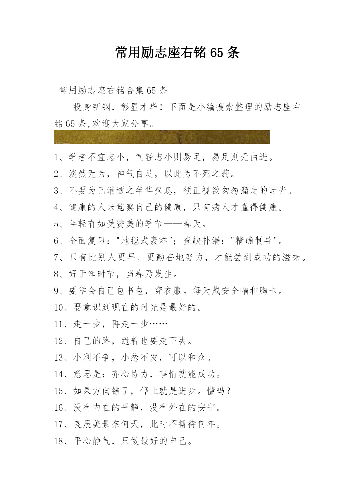 常用励志座右铭65条常用励志座右铭合集65条投身新钢,彰显才华!下面是小编搜索整理的励志座右铭65条,欢迎大家分享。1、学者不宜志小,气轻志小则易足,易足则无由进。2、淡然无为,神气自足,以此为不死之药。3、不要为已消逝之年华叹息,须正视欲匆匆溜走的时光。4、健康的人未觉察自己的健康,只有病人才懂得健康。5、年轻有如受赞美的季节——春天。6、全面复习:"地毯式轰炸";查缺补漏:"精确制导"。7、只有比别人更早、更勤奋地努力,才能尝到成功的滋味。8、好于知时节,当春乃发生。9、要学会自己包书包,穿衣服。每天
