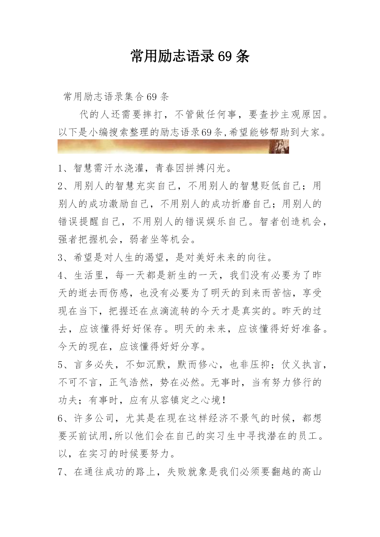 常用励志语录69条常用励志语录集合69条代的人还需要摔打,不管做任何事,要查抄主观原因。以下是小编搜索整理的励志语录69条,希望能够帮助到大家。1、智慧需汗水浇灌,青春因拼搏闪光。2、用别人的智慧充实自己,不用别人的智慧贬低自己;用别人的成功激励自己,不用别人的成功折磨自己;用别人的错误提醒自己,不用别人的错误娱乐自己。智者创造机会,强者把握机会,弱者坐等机会。3、希望是对人生的渴望,是对美好未来的向往。4、生活里,每一天都是新生的一天,我们没有必要为了昨天的逝去而伤感,也没有必要为了明天的到来而苦恼,享