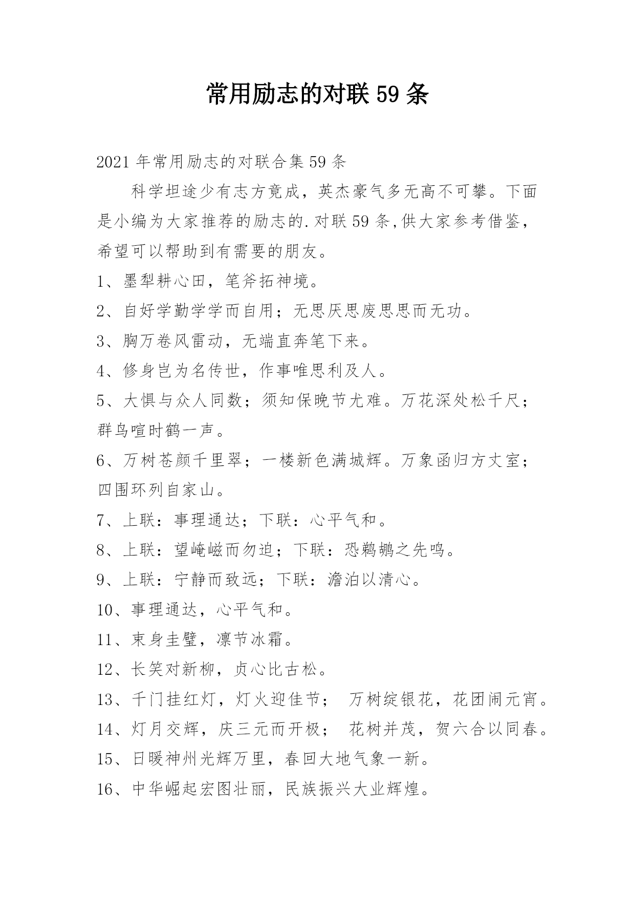 常用励志的对联59条2021年常用励志的对联合集59条科学坦途少有志方竟成,英杰豪气多无高不可攀。下面是小编为大家推荐的励志的.对联59条,供大家参考借鉴,希望可以帮助到有需要的朋友。1、墨犁耕心田,笔斧拓神境。2、自好学勤学学而自用;无思厌思废思思而无功。3、胸万卷风雷动,无端直奔笔下来。4、修身岂为名传世,作事唯思利及人。5、大惧与众人同数;须知保晚节尤难。万花深处松千尺;群鸟喧时鹤一声。6、万树苍颜千里翠;一楼新色满城辉。万象函归方丈室;四围环列自家山。7、上联:事理通达;下联:心平气和。8、上联: