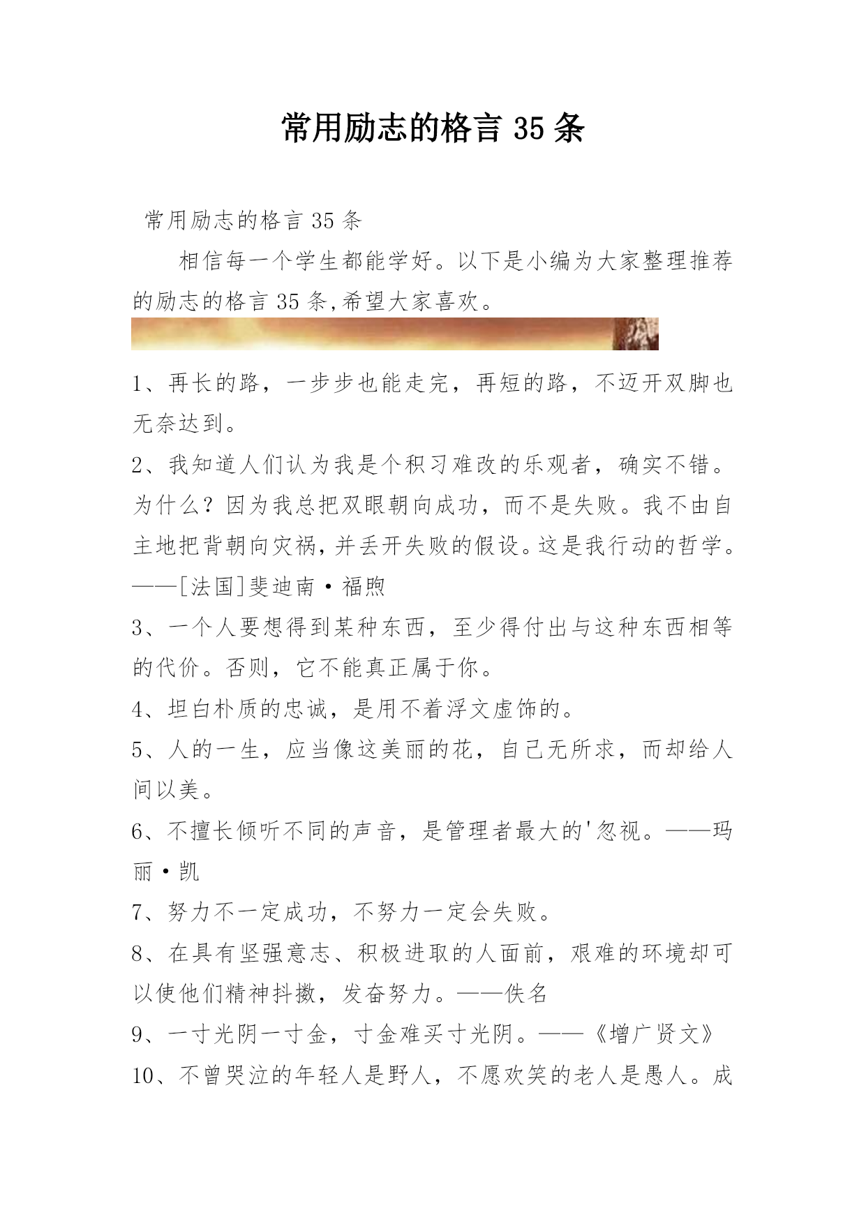 常用励志的格言35条常用励志的格言35条相信每一个学生都能学好。以下是小编为大家整理推荐的励志的格言35条,希望大家喜欢。1、再长的路,一步步也能走完,再短的路,不迈开双脚也无奈达到。2、我知道人们认为我是个积习难改的乐观者,确实不错。为什么?因为我总把双眼朝向成功,而不是失败。我不由自主地把背朝向灾祸,并丢开失败的假设。这是我行动的哲学。——[法国]斐迪南·福煦3、一个人要想得到某种东西,至少得付出与这种东西相等的代价。否则,它不能真正属于你。4、坦白朴质的忠诚,是用不着浮文虚饰的。5、人的一生,应当像