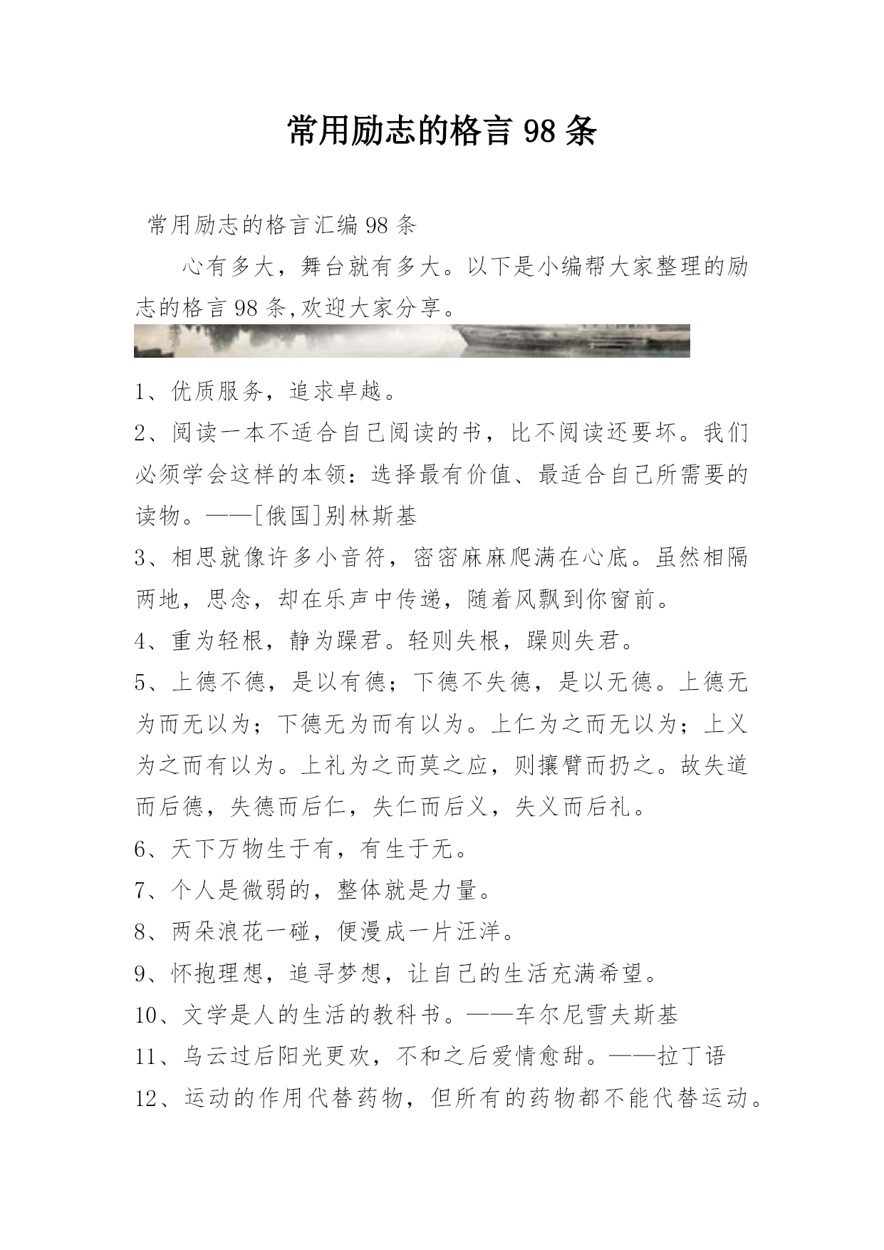 常用励志的格言98条常用励志的格言汇编98条心有多大,舞台就有多大。以下是小编帮大家整理的励志的格言98条,欢迎大家分享。1、优质服务,追求卓越。2、阅读一本不适合自己阅读的书,比不阅读还要坏。我们必须学会这样的本领:选择最有价值、最适合自己所需要的读物。——[俄国]别林斯基3、相思就像许多小音符,密密麻麻爬满在心底。虽然相隔两地,思念,却在乐声中传递,随着风飘到你窗前。4、重为轻根,静为躁君。轻则失根,躁则失君。5、上德不德,是以有德;下德不失德,是以无德。上德无为而无以为;下德无为而有以为。上仁为之而