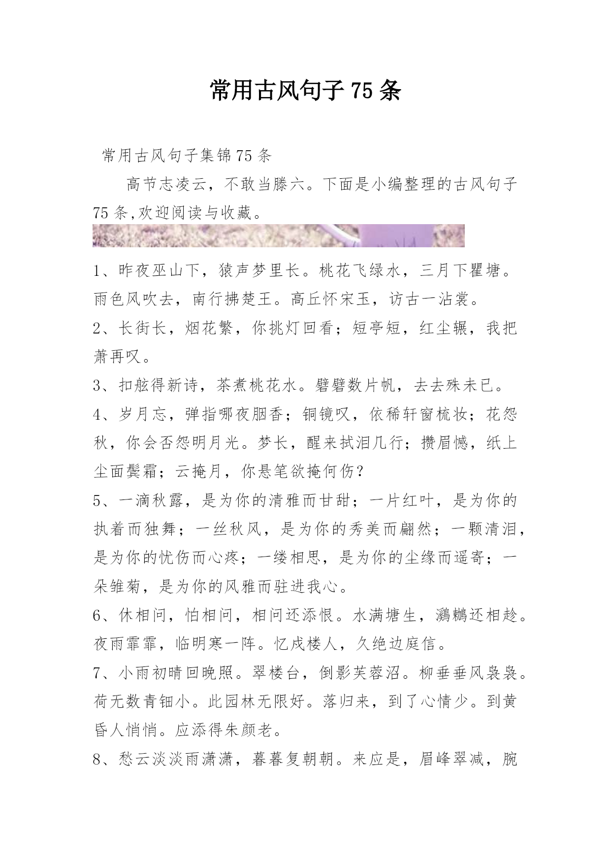 常用古风句子75条常用古风句子集锦75条高节志凌云,不敢当滕六。下面是小编整理的古风句子75条,欢迎阅读与收藏。1、昨夜巫山下,猿声梦里长。桃花飞绿水,三月下瞿塘。雨色风吹去,南行拂楚王。高丘怀宋玉,访古一沾裳。2、长街长,烟花繁,你挑灯回看;短亭短,红尘辗,我把萧再叹。3、扣舷得新诗,茶煮桃花水。礕礕数片帆,去去殊未已。4、岁月忘,弹指哪夜胭香;铜镜叹,依稀轩窗梳妆;花怨秋,你会否怨明月光。梦长,醒来拭泪几行;攒眉憾,纸上尘面鬓霜;云掩月,你悬笔欲掩何伤?5、一滴秋露,是为你的清雅而甘甜;一片红叶,是为