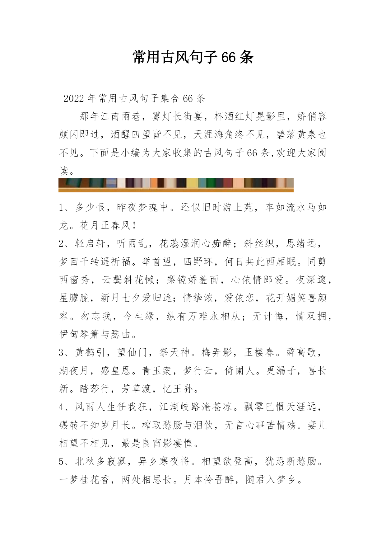 常用古风句子66条2022年常用古风句子集合66条那年江南雨巷,雾灯长街宴,杯酒红灯晃影里,娇俏容颜闪即过,酒醒四望皆不见,天涯海角终不见,碧落黄泉也不见。下面是小编为大家收集的古风句子66条,欢迎大家阅读。1、多少恨,昨夜梦魂中。还似旧时游上苑,车如流水马如龙。花月正春风!2、轻启轩,听雨乱,花蕊湿润心痴醉;斜丝织,思绪远,梦回千转遥祈福。举首望,四野环,何日共此西厢眠。同剪西窗秀,云鬓斜花懒;梨镜娇羞面,心依情郎爱。夜深邃,星朦胧,新月七夕爱归途;情挚浓,爱依恋,花开媚笑喜颜容。勿忘我,今生缘,纵有万