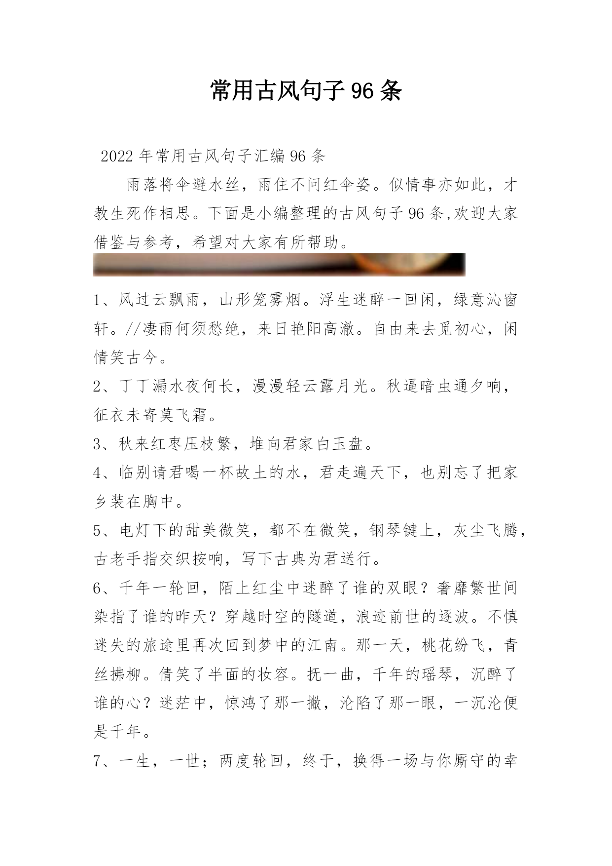 常用古风句子96条2022年常用古风句子汇编96条雨落将伞避水丝,雨住不问红伞姿。似情事亦如此,才教生死作相思。下面是小编整理的古风句子96条,欢迎大家借鉴与参考,希望对大家有所帮助。1、风过云飘雨,山形笼雾烟。浮生迷醉一回闲,绿意沁窗轩。//凄雨何须愁绝,来日艳阳高澈。自由来去觅初心,闲情笑古今。2、丁丁漏水夜何长,漫漫轻云露月光。秋逼暗虫通夕响,征衣未寄莫飞霜。3、秋来红枣压枝繁,堆向君家白玉盘。4、临别请君喝一杯故土的水,君走遍天下,也别忘了把家乡装在胸中。5、电灯下的甜美微笑,都不在微笑,钢琴键上